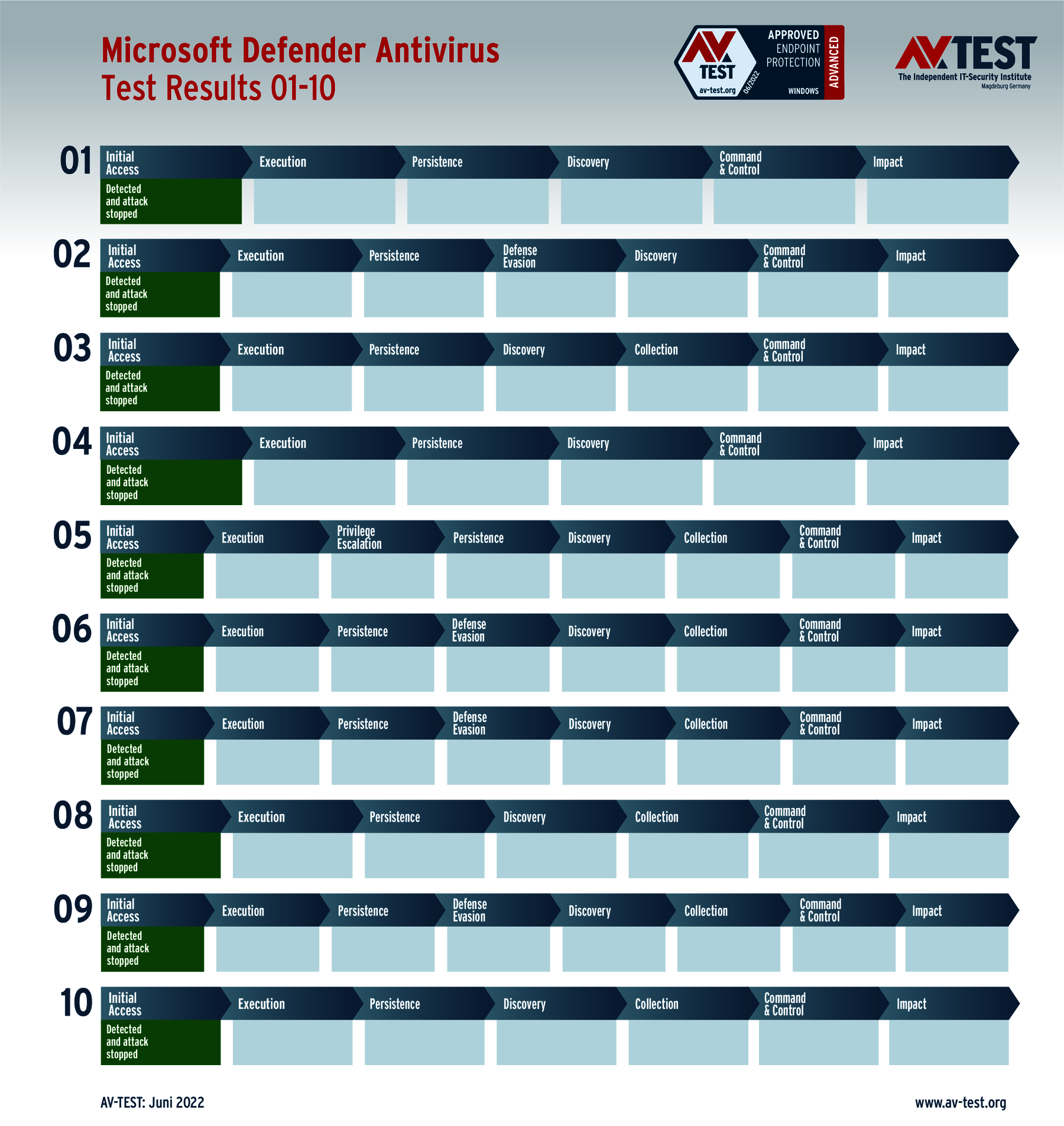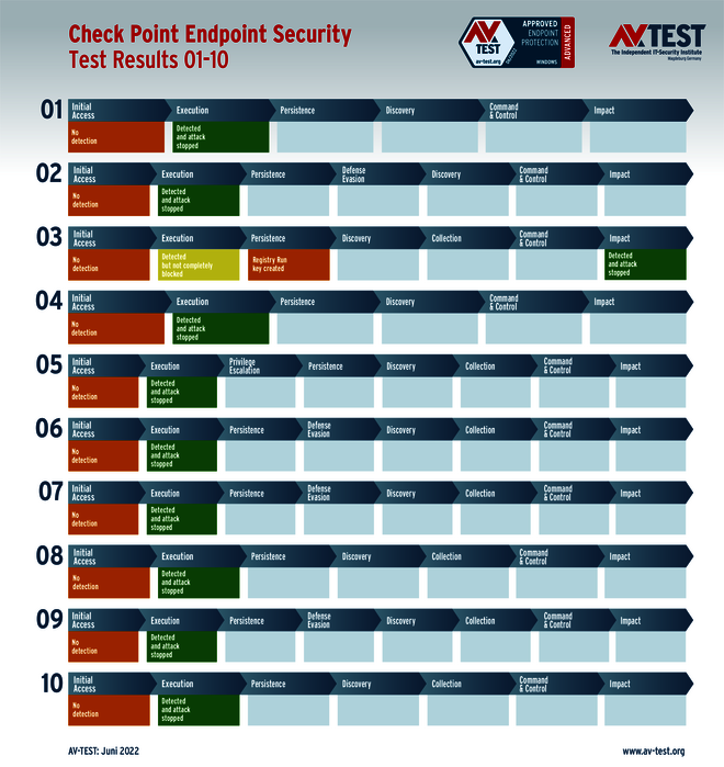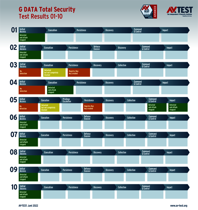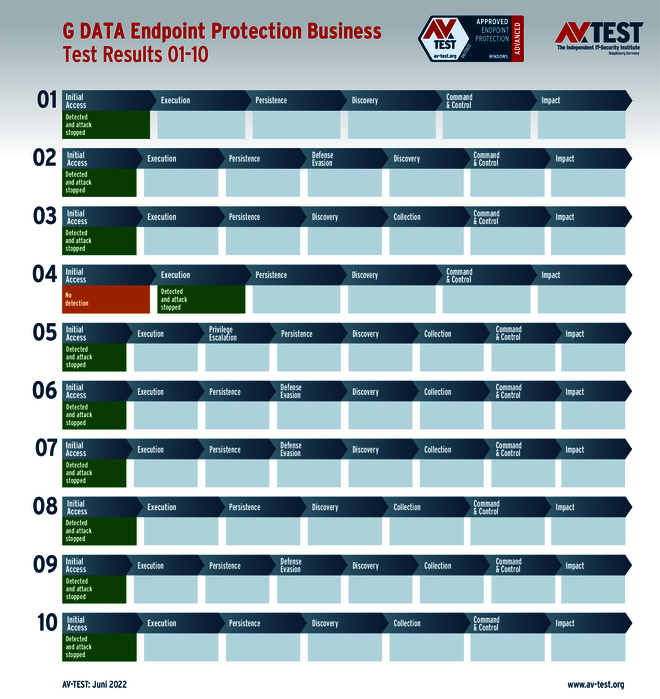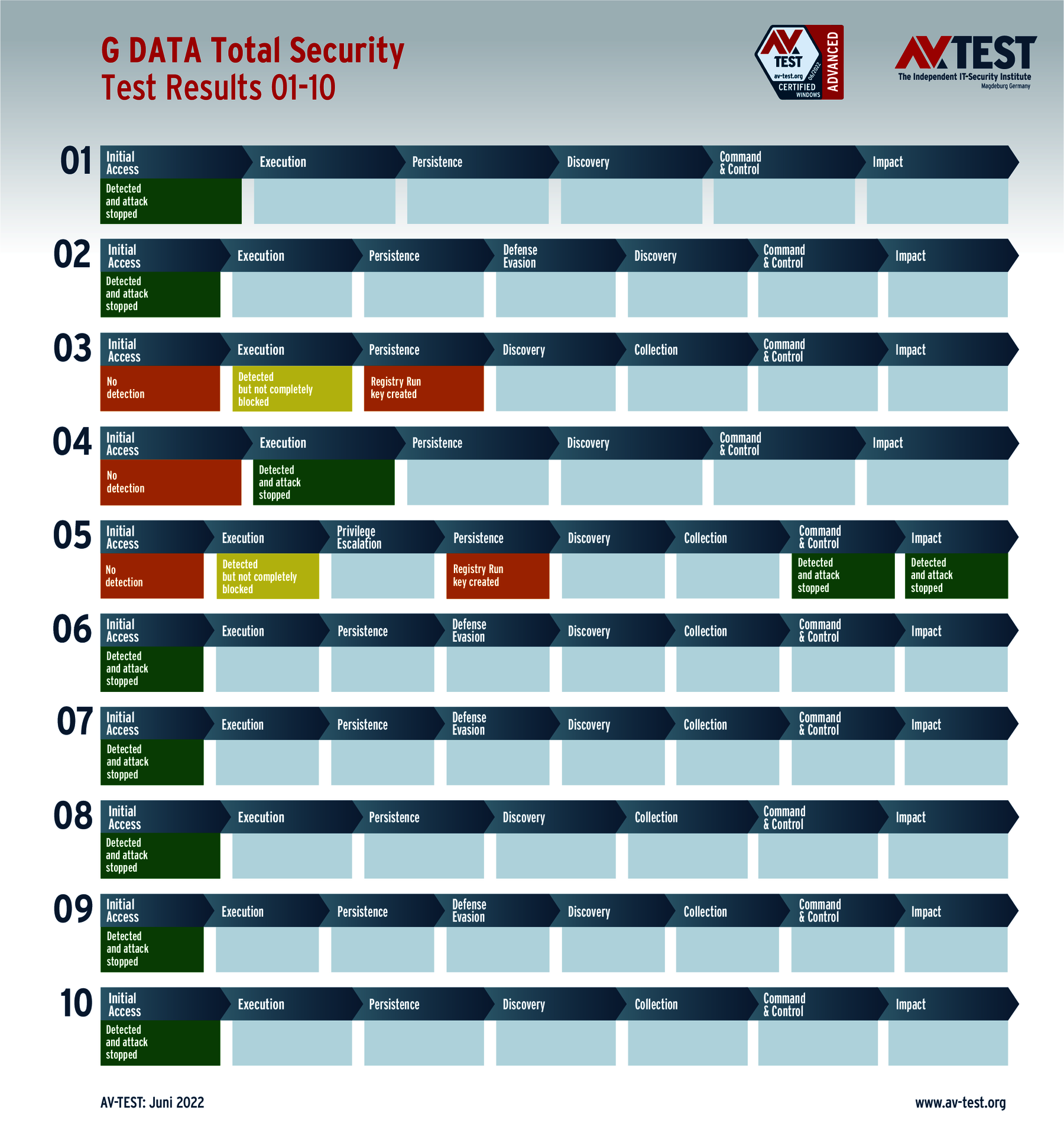 C’est pourquoi le test Advanced Threat Protection présente dans les graphiques d’évaluation toutes les étapes d’une attaque au ransomware, et à partir de quel moment la solution de protection stoppe l’attaque intégralement, partiellement ou pas du tout. Toutes les étapes sont alors évaluées, le laboratoire attribuant dans ce test jusqu’à 4 points à chaque scénario. Les produits peuvent ainsi atteindre un score de protection maximal de 40 points dans 10 scénarios.