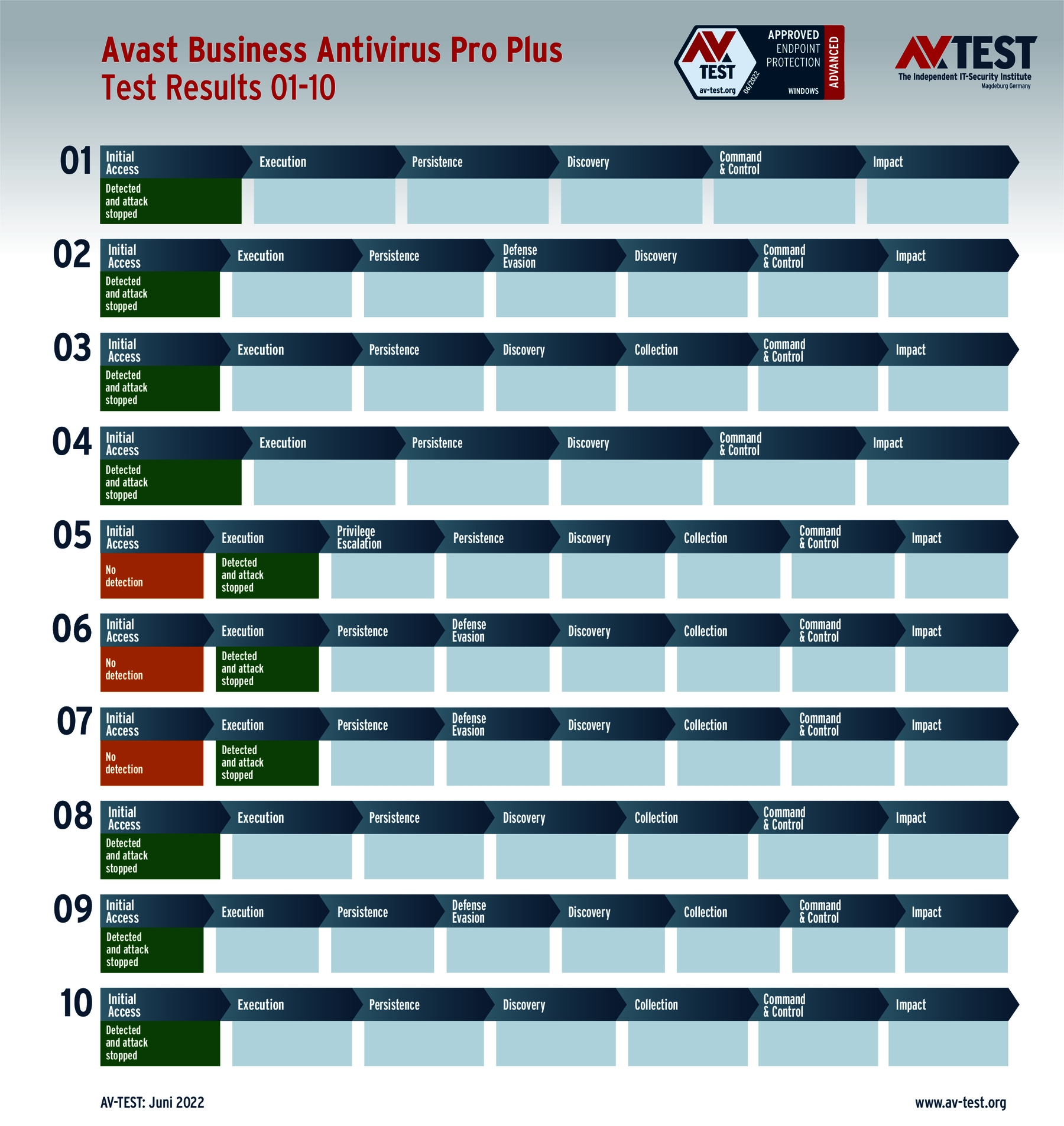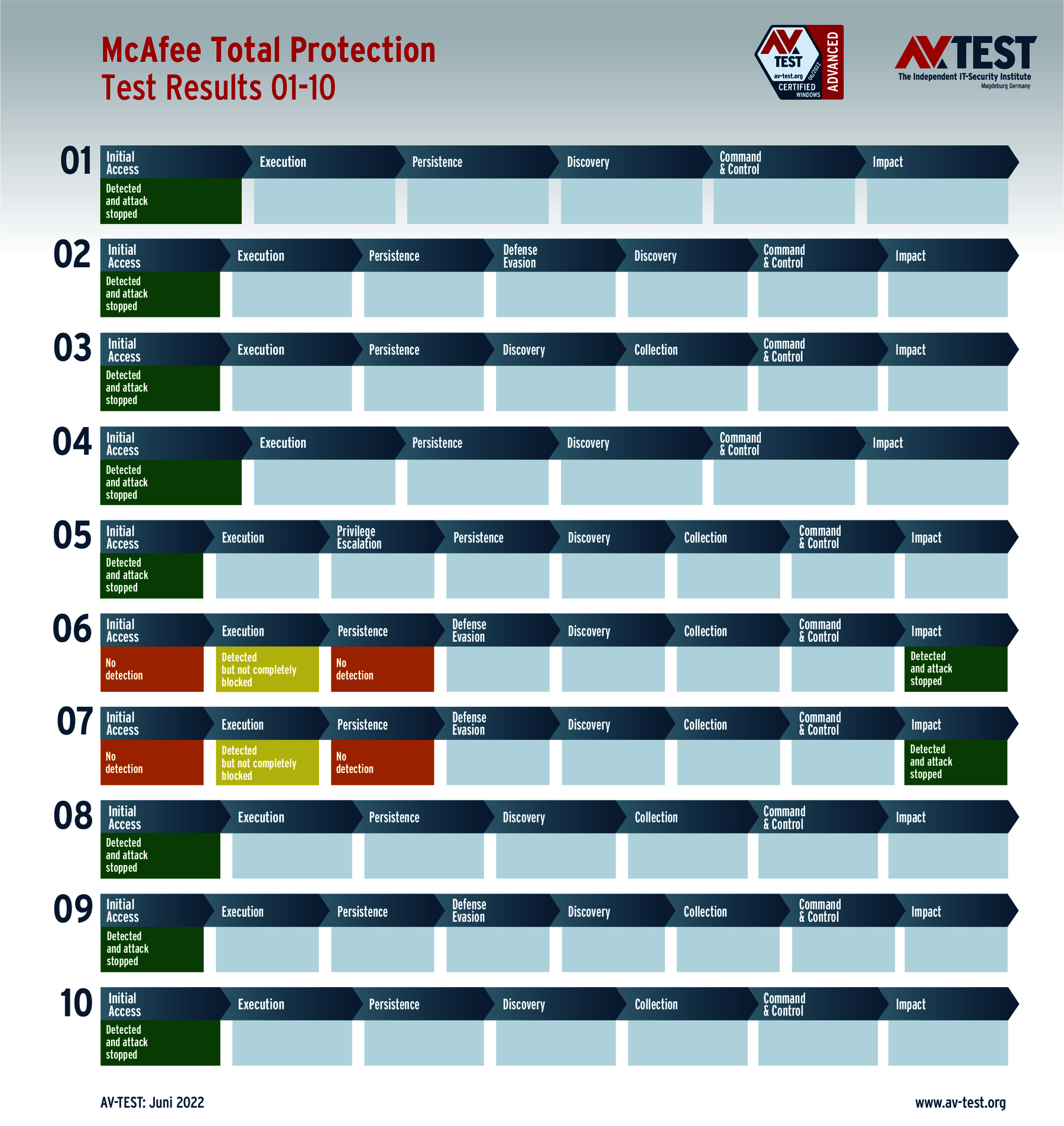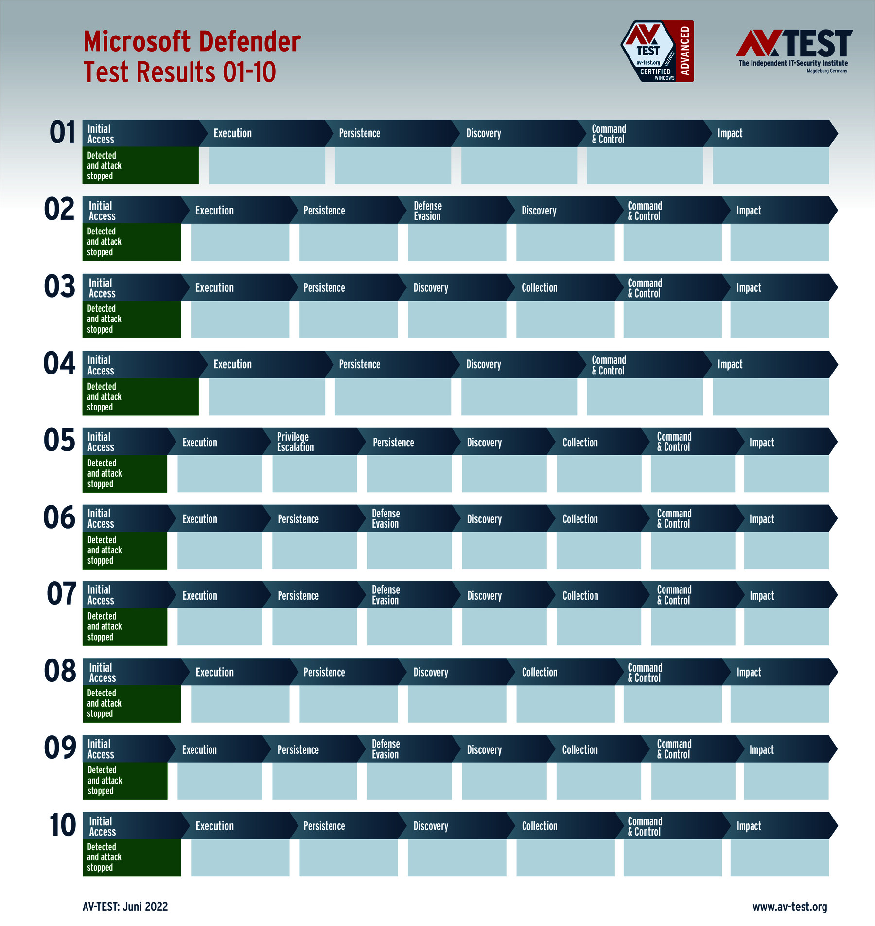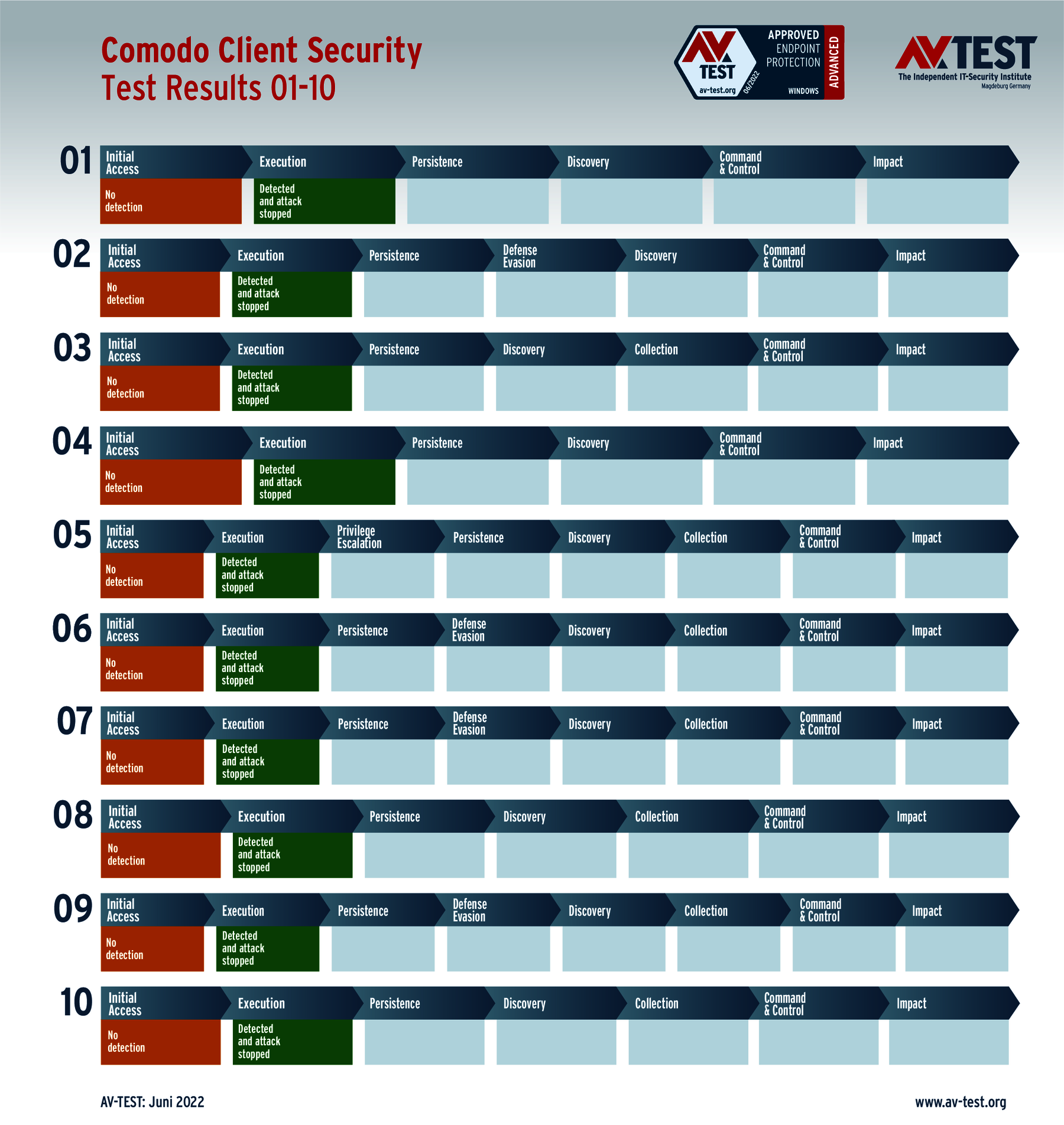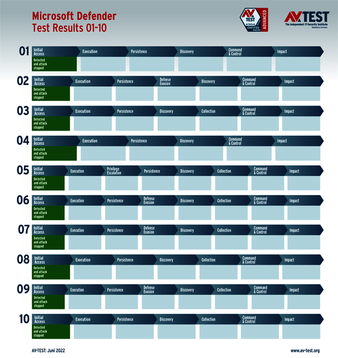 Dans un test de détection classique, il n’y a que deux résultats possibles : « détecté » ou « non détecté ». Dans le test actuel d’une plus grande ampleur, c’est un peu différent. Dans un premier temps, on note comme d’habitude si la solution détecte l’attaque ou non. À ce stade, il est encore possible qu’elle la détecte même plus tard grâce à d’autres actions, la stoppe et supprime au moins une partie des attaquants.