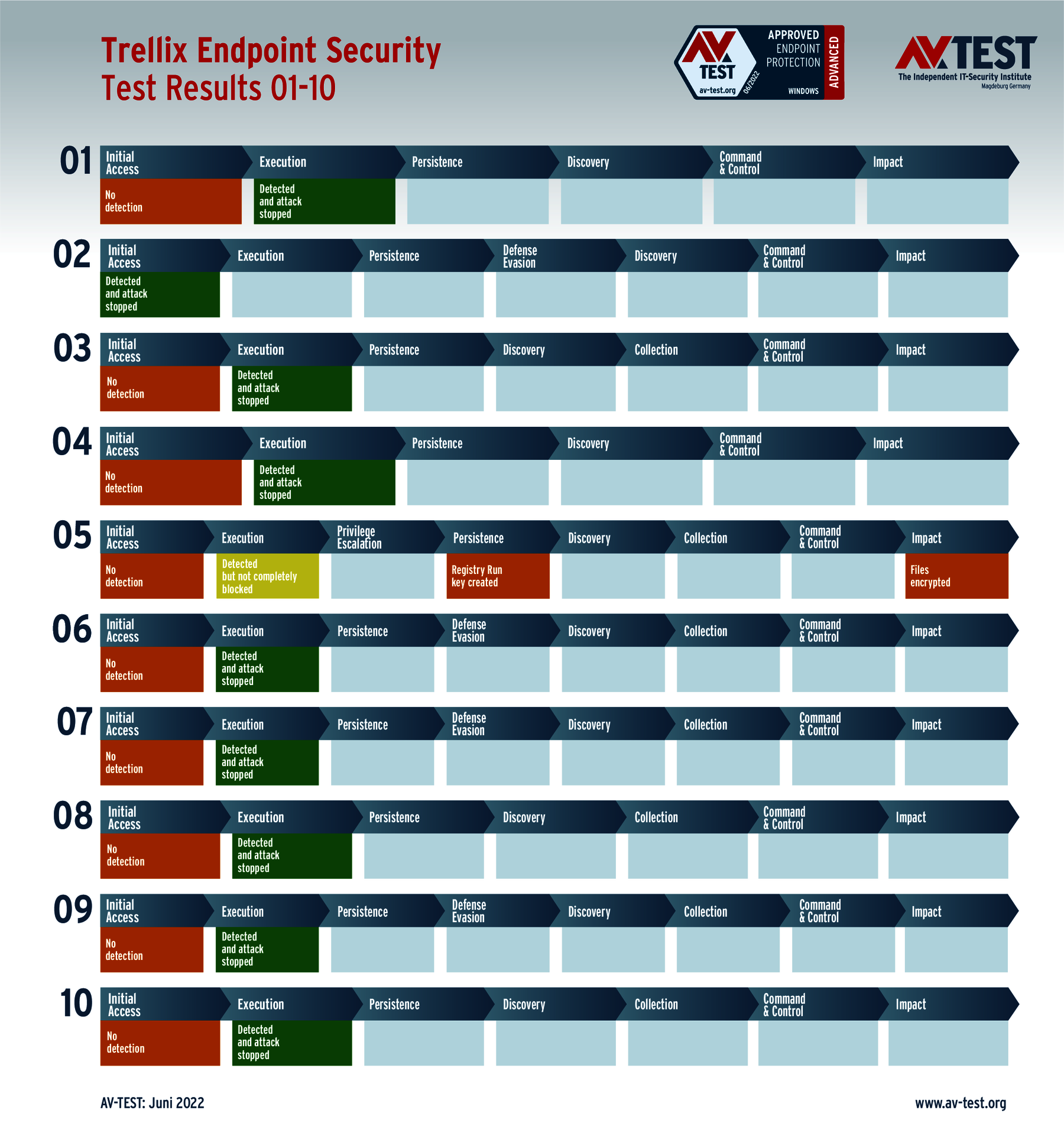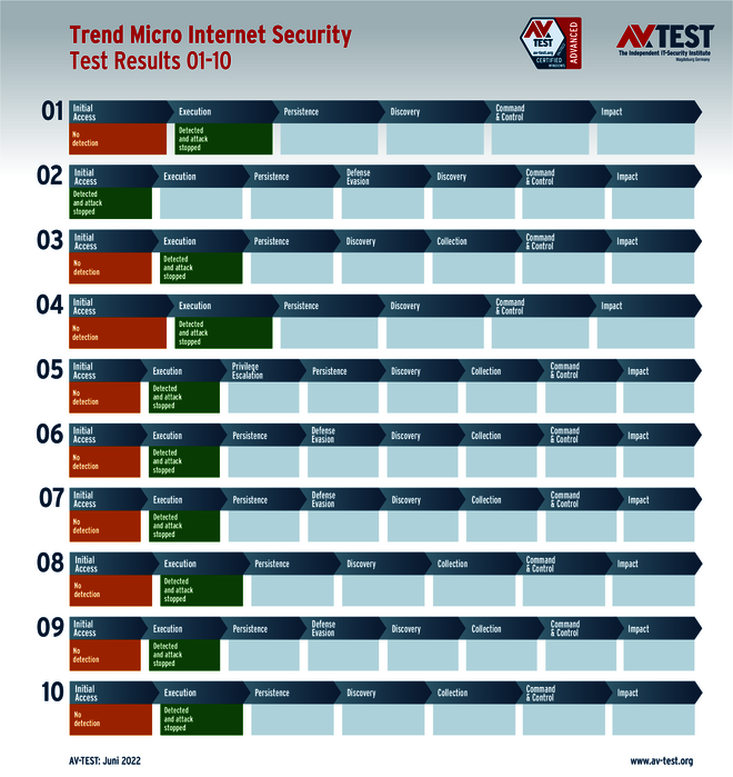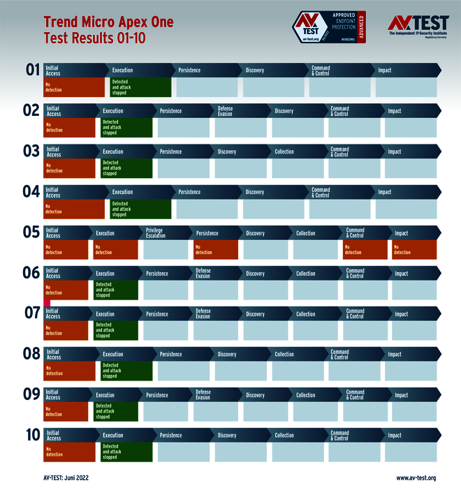 Dans 9 cas sur 10, Trend Micro affiche une défense irréprochable. À la 10e attaque, l’attaquant n’est cependant détecté ni au début ni au cours d’étapes ultérieures, ce qui permet au ransomware de parvenir à ses fins.