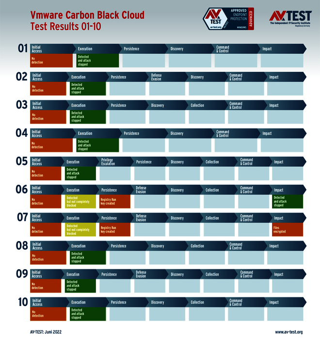 Les différents graphiques présentant les résultats se lisent de la façon suivante : Le déroulement du test est présenté sur une ligne par ransomware attaquant. Il y a donc 10 lignes de résultats. Si un ransomware est bloqué par la suite de protection au cours de l’une des deux premières étapes (initial access ou execution), on considère que l’attaque a été contrée avec succès. Si c’est le cas, le code couleur affiche la couleur verte : attaque stoppée. Jaune signifie : partiellement stoppée. Orange signale : attaque non stoppée (no detection). Le champ jaune à la fin peut indiquer deux résultats : si l’attaque n’a été que partiellement détectée, alors soit certains fichiers sont cryptés (some files encrypted), soit le ransomware a été empêché de crypter, mais il reste dans le système (malware remains on system). Si on trouve un champ orange à la fin de la série de graphiques, cela signifie que l’attaque n’a pas été détectée et que le ransomware a pu s’exécuter complètement (files encrypted).