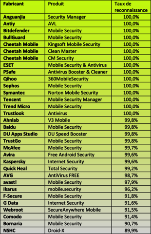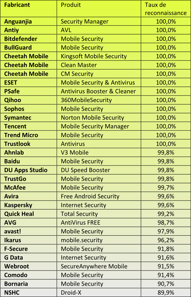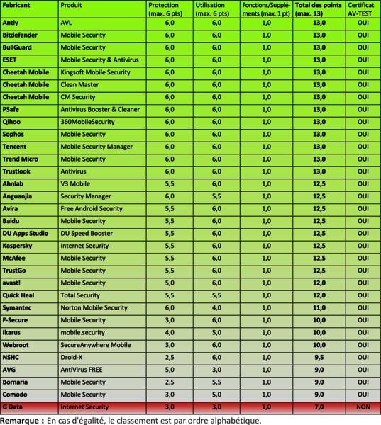 Pas moins de 13 applications occupent la tête du classement avec une note respective de 13/13. Elles sont fabriquées par Antiy, Bitdefender, BullGuard, Cheetah Mobile (3 produits), ESET, PSafe, Qihoo, Sophos, Tencent, Trend Micro et Trustlook. La plupart des applications peut être utilisée complètement gratuitement. Après une phase de test gratuite, quelques applications isolées offrent des fonctions premium particulières contre paiement d'un supplément. Cependant, la fonction de protection n'est jamais désactivée même après la phase de test.
