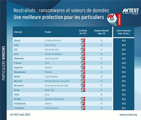 Au total, 16 produits de sécurité pour utilisateurs particuliers ont été soumis au test Advanced Threat Protection (ATP) en juillet et en août 2023. Il s’agit des produits des fabricants suivants : AhnLab, Avast, AVG, Avira, Bitdefender, F-Secure, Kaspersky, Malwarebytes, McAfee, Microsoft, Microworld, Norton, Panda, PC Matic, Protected.net et Trend Micro.