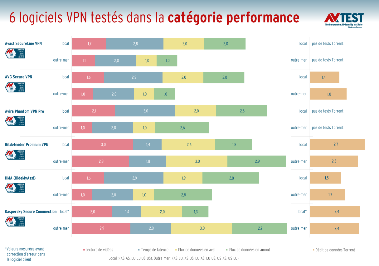 En ce qui concerne la mesure de la lecture des vidéos, les valeurs sont très diverses. Si l’on considère les valeurs « locales », Kaspersky qui obtient 2,0 points et Avira 2,1 se situent dans la moyenne ou légèrement au-dessus. Bitdefender qui totalise ici 3,0 points se place en tête de liste. Tous les autres logiciels ne remportent qu’entre 1,6 et 1,7 points pour leurs performances. En ce qui concerne les valeurs « outre-mer », seuls Bitdefender avec 2,8 et Kaspersky avec 2,9 points sont intéressants. Tous les autres logiciels VPN n’obtiennent que 1,0 ou 1,1 point dans la catégorie « outre-mer ».