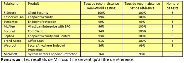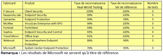 Le test en continu actuel d'AV-TEST, qui englobe neuf solutions de sécurité, confirme la stabilité des produits disponibles de Fortinet, F-Secure, Kaspersky Lab, McAfee, Sophos, Symantec, Trend Micro et Webroot. À titre comparatif, la suite de sécurité pour terminaux de Microsoft a également été testée, mais elle n'a pas été évaluée. En effet, la suite n'est pas un produit en soi mais elle fait partie du Microsoft System Center 2012. Les propriétaires d'une licence pour la Management Suite détiennent aussi automatiquement le module System Center Endpoint Protection 2012. Sans la Management Suite, le paquet de protection pour postes clients ne pourrait pas fonctionner.