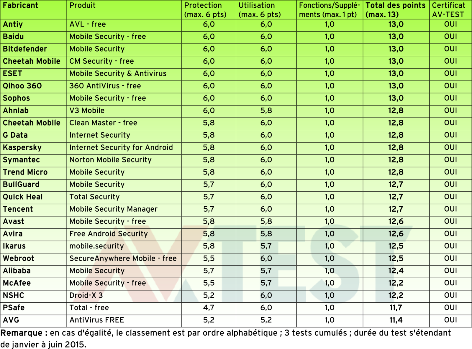 Si l'on s'intéresse uniquement à la protection, alors on a le choix entre 8 applications qui ont chacune obtenu la note moyenne maximale de 6/6 lors des trois séries de tests : Antiy, Baidu, Bitdefender, Cheetah Mobile (CM Security), ESET, Qihoo 360, Sophos et Ahnlab. Toutes les suites de protection ont pour cela dû analyser, identifier et supprimer près de 9 000 applications contaminées. Il ne s'agissait pas d'une tâche facile puisque les autres applications de sécurité sont plusieurs fois passées à côté de quelques attaquants.