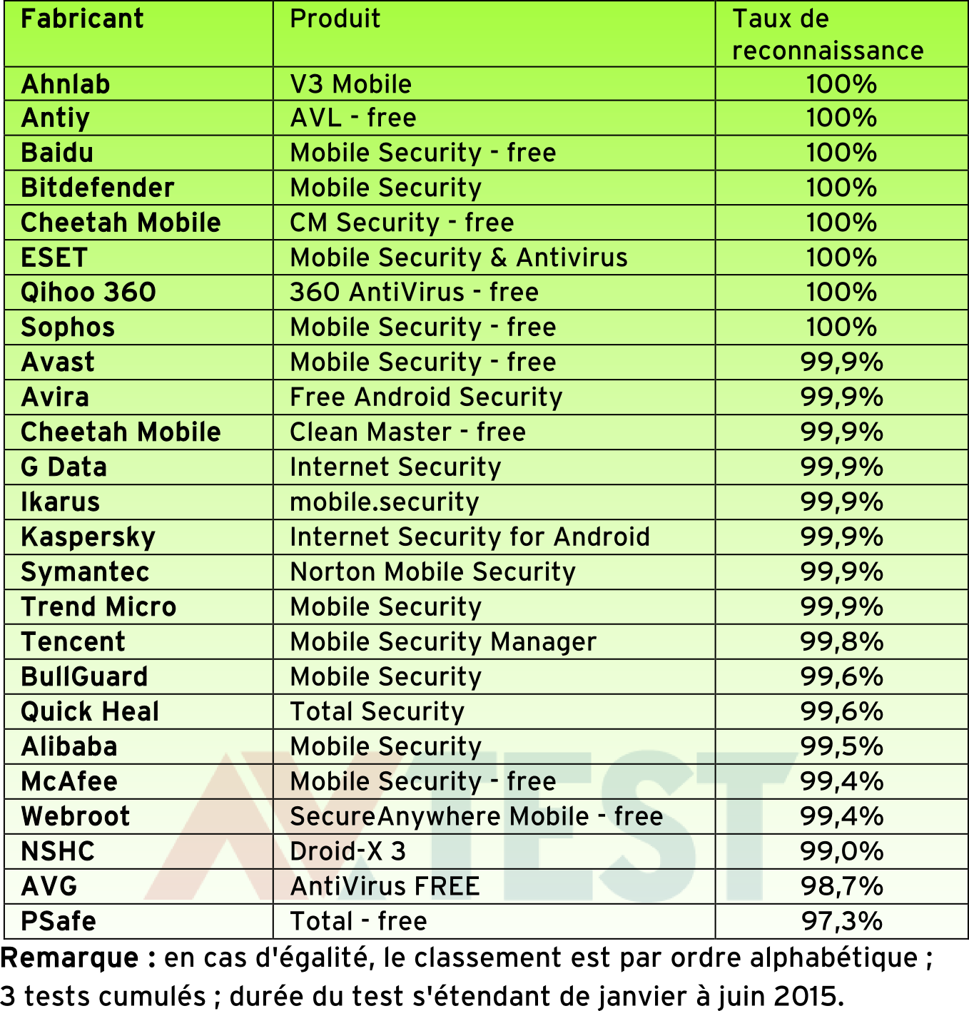 la plupart des applications ont fait preuve d'une bonne reconnaissance dans tous les tests (AV-TEST, version de juin 2015).