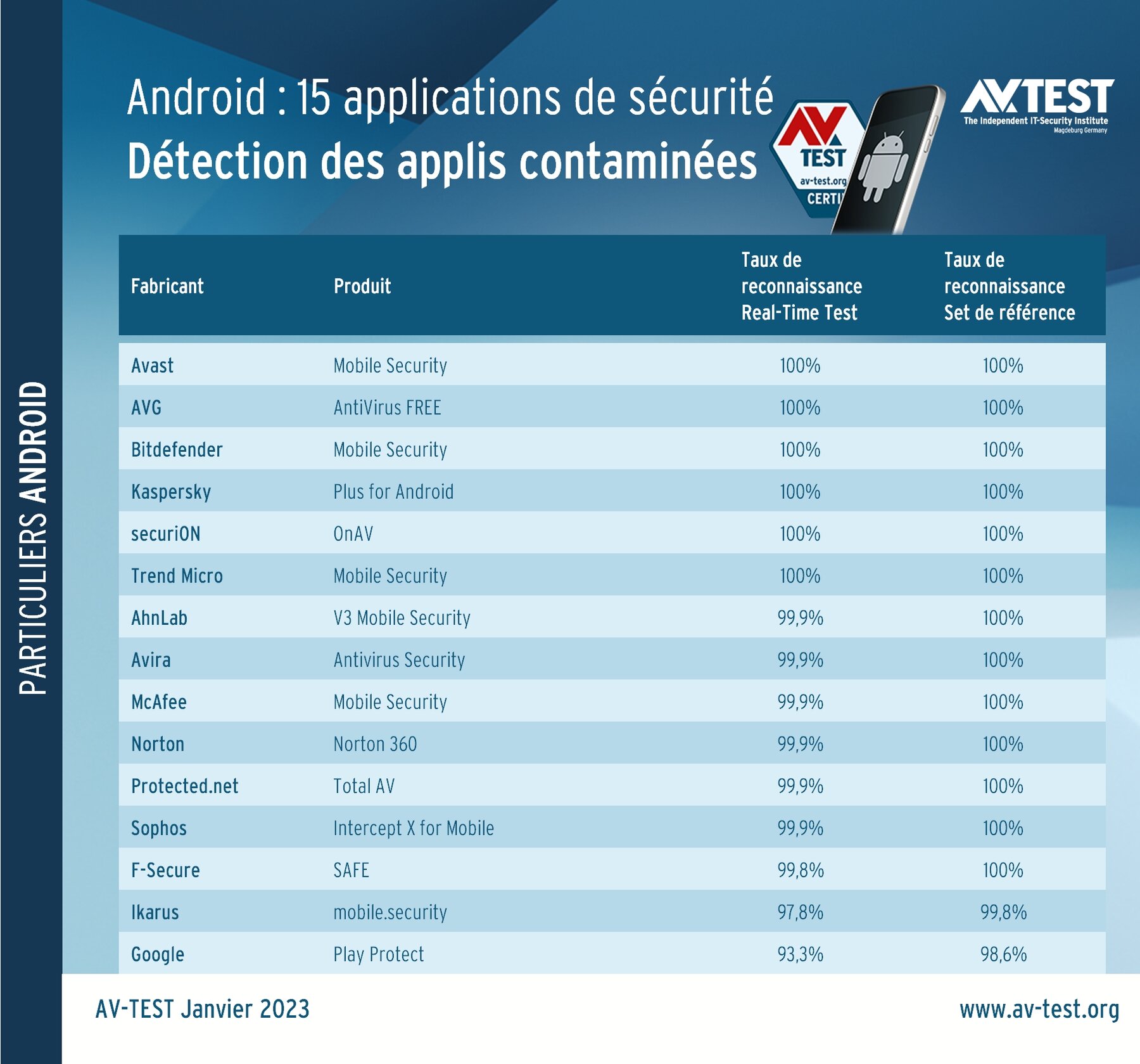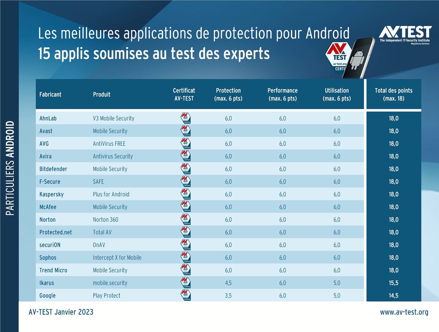 Après un bref coup d'œil au tableau, il est vivement recommandé aux utilisateurs d’Android de confier la protection de leurs appareils à l’une des 13 applications de sécurité sur les 15 énumérées. Il s’agit des applications d’AhnLab, Avast, AVG, Avira, Bitdefender, F-Secure, Kaspersky, McAfee, Norton, Protected.net, securiON, Sophos et Trend Micro.