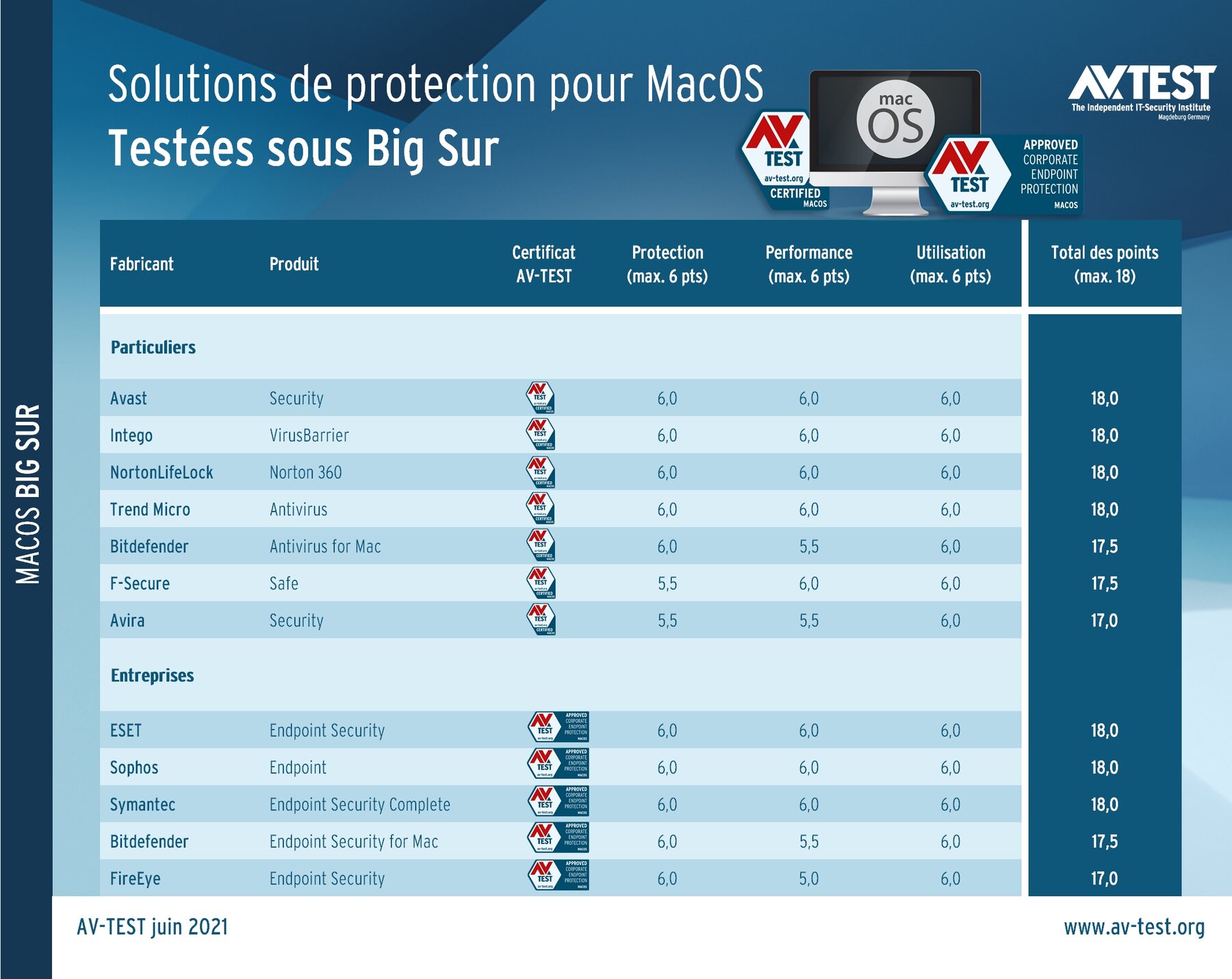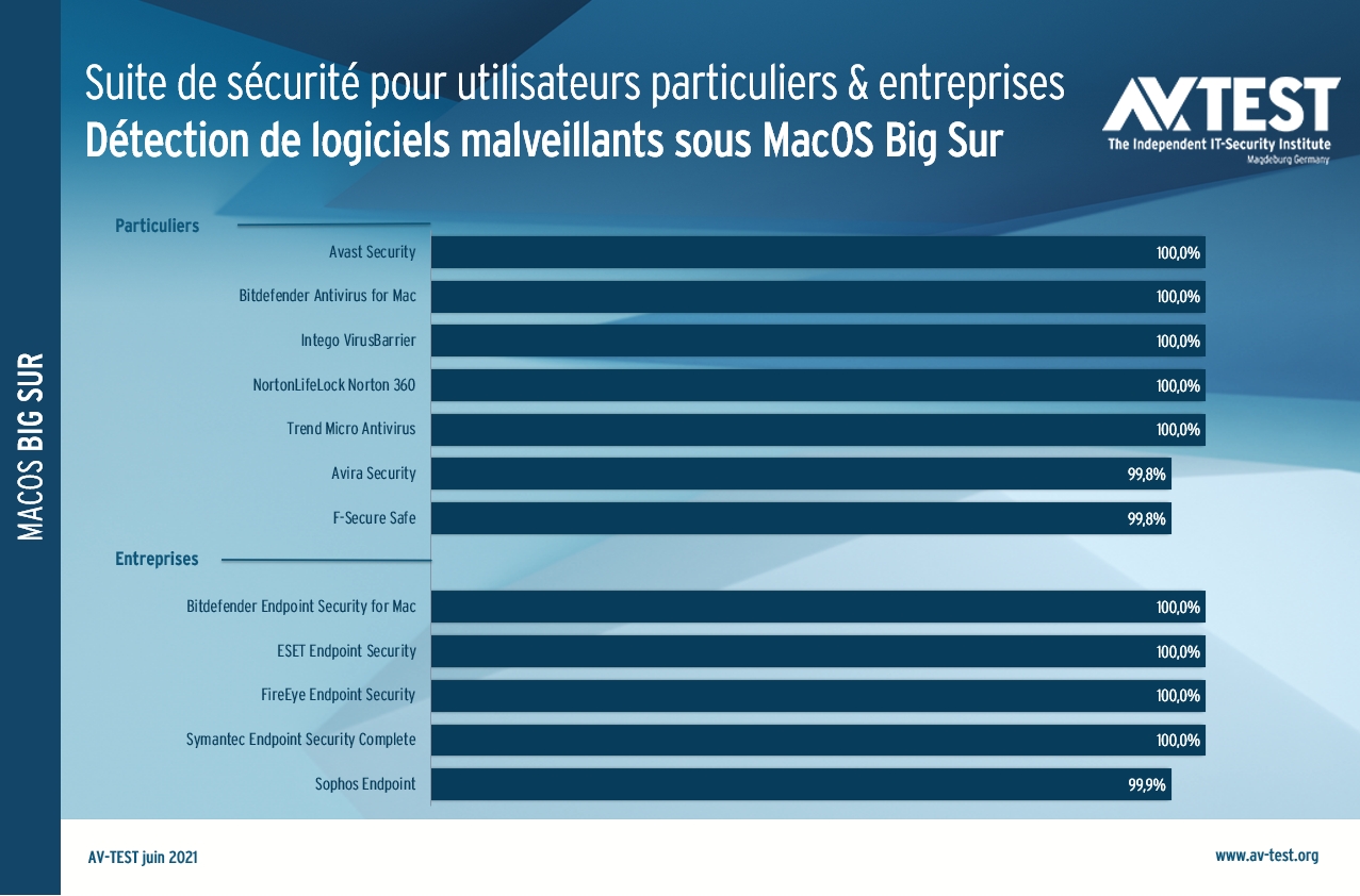 Le laboratoire a mis au banc d’essai 7 suites antivirus pour particuliers et 5 solutions pour endpoints Mac en entreprise. MacOS Big Sur a servi de plate-forme de test. Les 5 suites de sécurité pour utilisateurs privés sont celles d’Avast, Avira, Bitdefender, F-Secure, Intego, NortonLifeLock et Trend Micro.