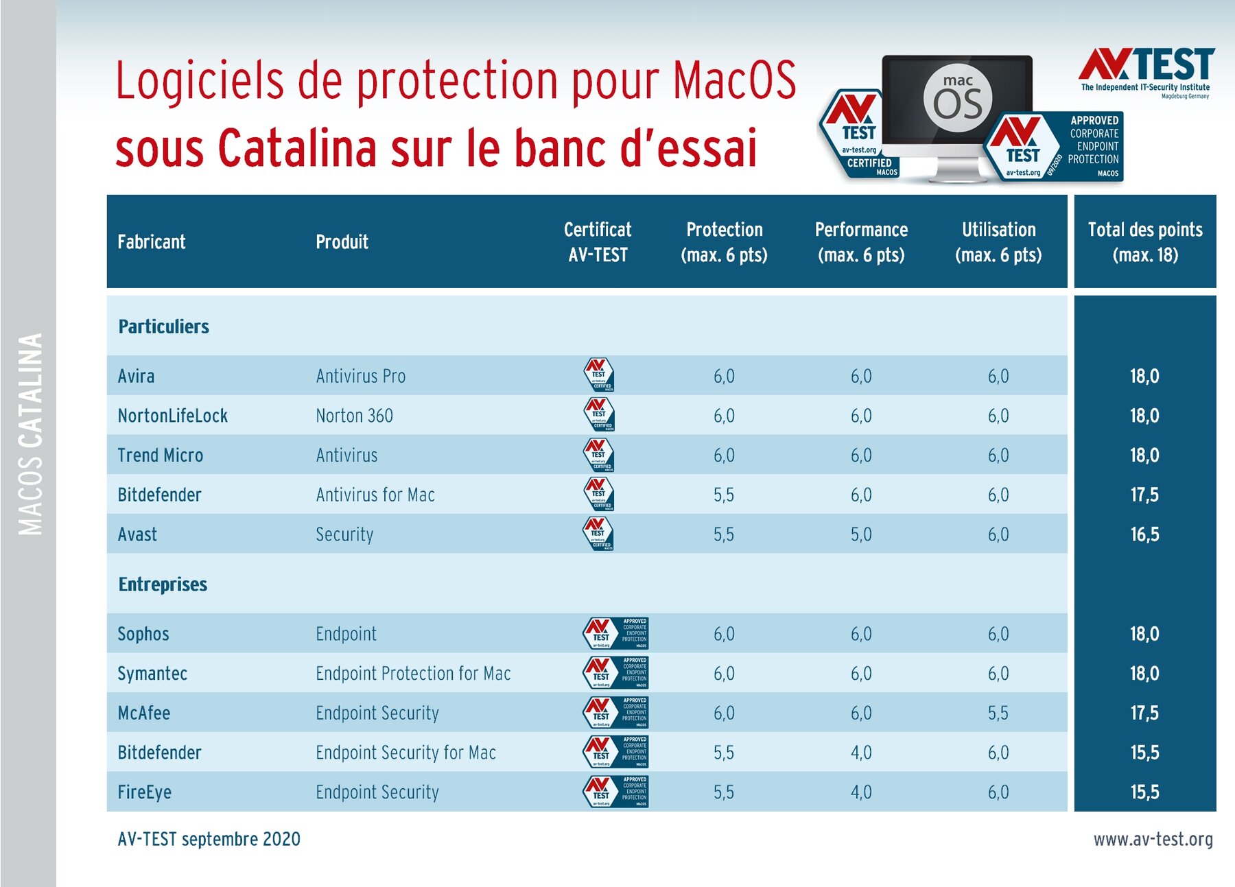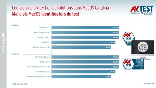 En septembre 2020, le laboratoire d’AV-TEST a analysé des suites de protection pour les particuliers utilisant Mac et des solutions pour les entreprises. MacOS Catalina dans sa version 10.15 a servi de plate-forme d’essai. Les 5 suites de protection pour utilisateurs particuliers mises au banc d’essai sont celles d’Avast, Avira, Bitdefender, NortonLifeLock et Trend Micro. Les solutions pour entreprises mises au banc d'essai sont conçues par Bitdefender, FireEye, McAfee, Sophos et Symantec.