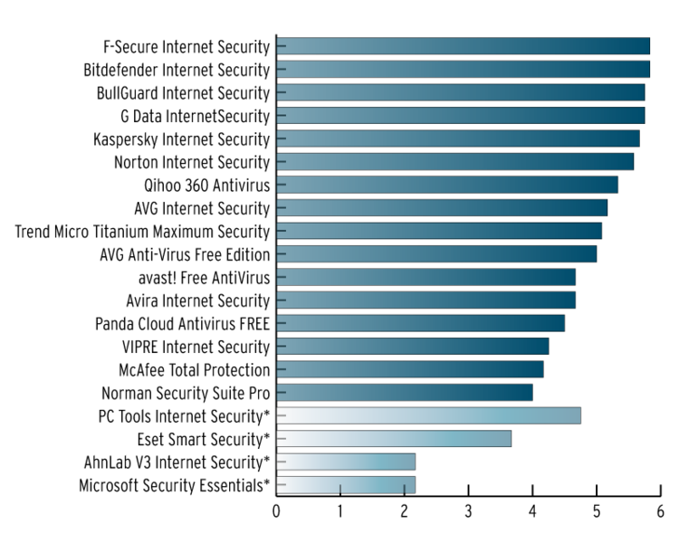 * Les produits suivants n'ont pas satisfait à tous les tests de l'année 2013 et n'ont par conséquent pas été pris en compte pour l'AWARD 2013 : AhnLab V3 Internet Security, Microsoft Security Essentials/Windows Defender et Microsoft System Center Endpoint Protection.