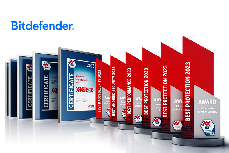 La saison des récompenses est lancée : pour la 13e fois, l’institut AV-TEST honore les fabricants de produits de sécurité destinés aux utilisateurs particuliers et aux entreprises à l’occasion de la remise des AV-TEST Awards 2023. Au cours de l’année 2023, l’incontournable institut a testé de nombreux produits en laboratoire sur les systèmes Windows, MacOS et Android et leur a attribué les certificats convoités qui valident la qualité de leurs performances. Seuls les produits ayant fait leurs preuves en réalisant continuellement les meilleurs scores décrochent un, voire plusieurs Awards 2023 comme trophée couronnant leur réussite. En plus de l’événement réjouissant que représente la remise des prix, l’institut AV-TEST fête également son 20e anniversaire cette année. Bitdefender a remporté pas moins de six des Awards en 2023. AV-TEST attribue à Bitdefender le prix dans la catégorie Best Performance et deux prix dans la catégorie Best Protection pour entreprises sous Windows. Viennent ensuite les prix Best Protection sous Windows, Best Android Security et Best MacOS Security pour les produits destinés aux utilisateurs particuliers.
