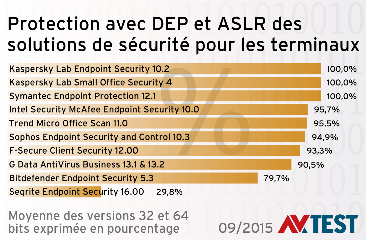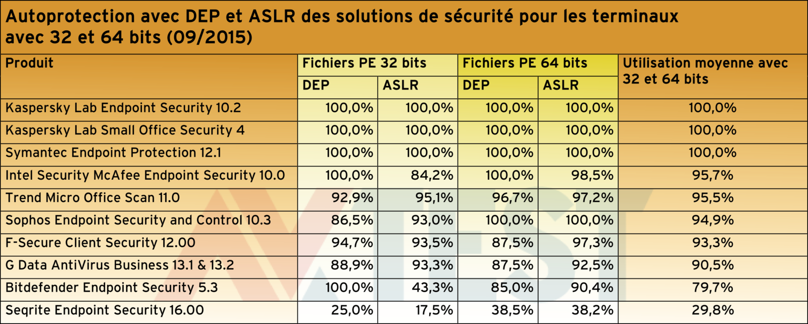 Les solutions destinées aux entreprises révèlent une meilleure évolution. 3 des 10 solutions emploient l’ASLR et la DEP 100 %: Kaspersky Lab avec ses versions Small Office et Endpoint ainsi que Symantec. 6 autres produits ont tout de même atteint entre 95,7 et 90,5 %. Seul le nouveau venu de Seqrite ne se protège qu’à 29,8 %.
