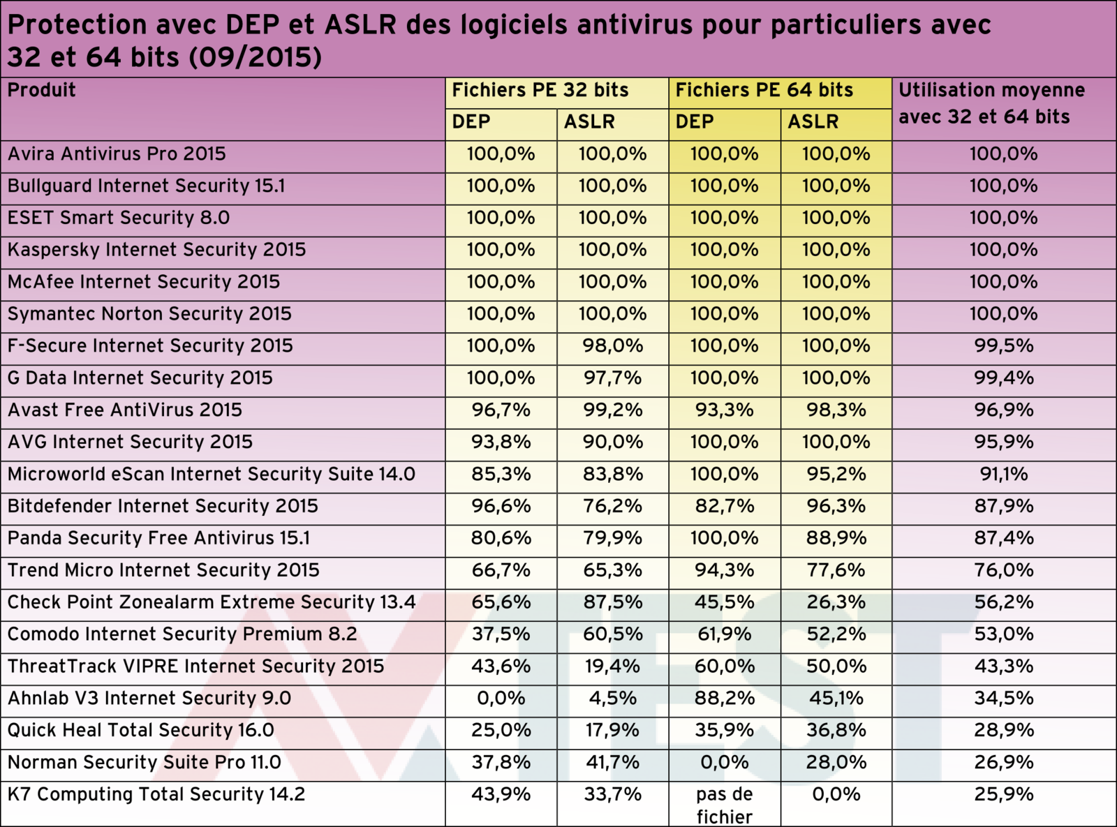 Alors que l’année passée, seul un produit possédait une protection de 100 % avec ASLR et DEP parmi les solutions destinées aux particuliers, le test actuel n’en compte pas moins de six : Avira, Bullguard, ESET, Kaspersky McAfee et Symantec. Deux autres suites ont atteint 99,4 et 99,5 % lors de l’analyse : F-Secure et G Data. Comme l’année dernière, les autres résultats diminuent ensuite petit à petit jusqu’à atteindre le minimum de 25,9%.