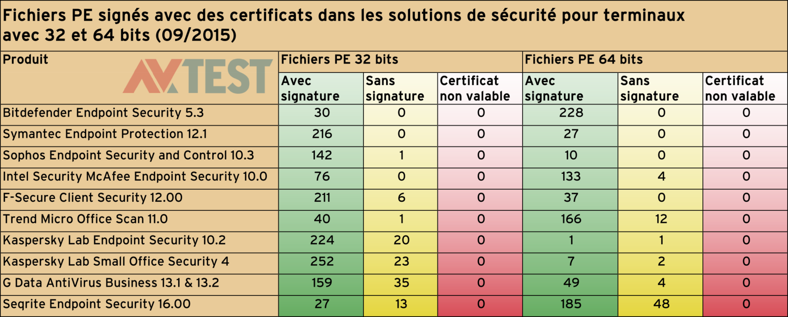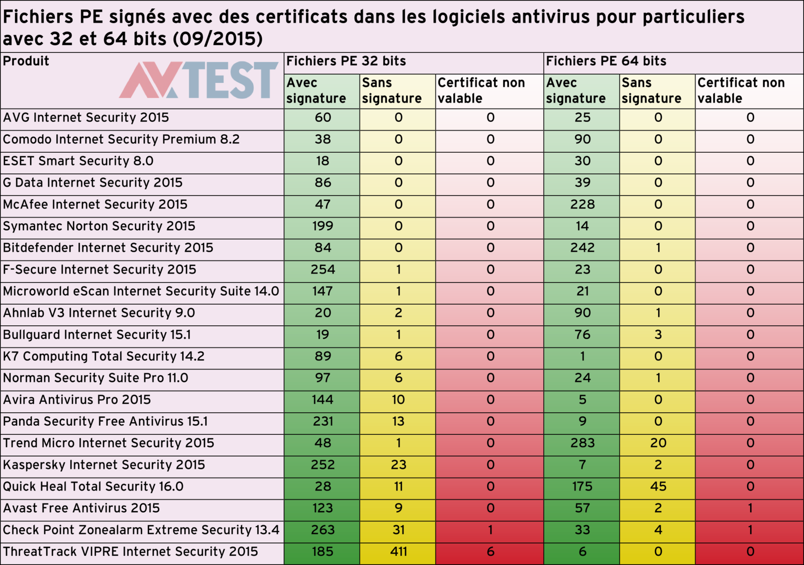 L’an passé, le laboratoire avait seulement vérifié si les fichiers PE importants en mode utilisateur (Portable Executable) pour 32 et 64 bits avaient recours à l’ASLR et à la DEP. Cette année, les testeurs ont aussi contrôlé si tous les fichiers PE étaient aussi signés par le fabricant de même que s’ils utilisaient un certificat valable. Après tout, les fabricants de logiciels de sécurité attendent aussi de la part de tous les autres éditeurs de logiciels qu’ils emploient des signatures et des certificats pour leurs fichiers. Ils facilitent en effet l’attribution du fichier au fabricant d’origine. Les fichiers sans signature des produits de sécurité ne représentent certes pas une grave vulnérabilité immédiate mais ont toutefois le potentiel de le devenir. Pour se protéger elle-même, une suite doit assurément pouvoir vérifier l’authenticité et l’intégrité de ses propres fichiers. Pour cela, les signatures numériques avec des certificats valables et des valeurs de hachage fournissent une aide précieuse. Ces valeurs seules ne suffisent certes pas à sécuriser les fichiers. Mais cette simple tâche est-elle cependant correctement accomplie par les fabricants de logiciels de sécurité ? L’analyse montre hélas qu’ils bâclent parfois la besogne.
