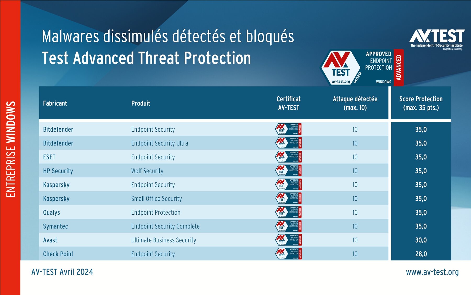 Les résultats des solutions pour entreprises au test ATP sont très satisfaisants pour la plupart des produits : 8 suites testées sur 10 ont réalisé des performances parfaites, affichant le score de protection maximal de 35 points : Bitdefender (avec 2 versions), ESET, HP Security, Kaspersky (avec 2 versions), Qualys et Symantec.