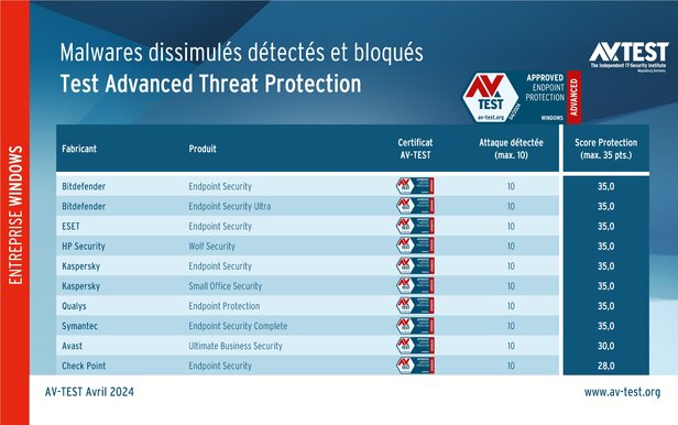 Du côté des solutions testées pour entreprises, ce sont les fabricants suivants qui ont participé au test : Avast, Bitdefender (avec 2 versions), Check Point, ESET, HP Security, Kaspersky (avec 2 versions), Qualys et Symantec.