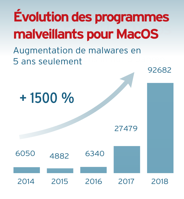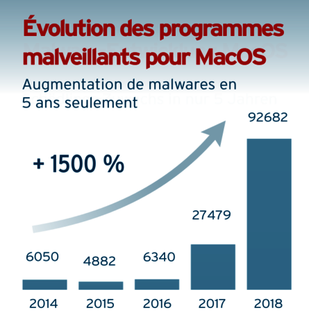De manière générale, le système MacOS est réputé pour sa résistance aux cyberattaques. Néanmoins, Apple se voit de plus en plus souvent contraint d’admettre que les systèmes présentent des failles de sécurité et que la publication de mises à jour peut durer des semaines, voire des mois. Apparemment, les auteurs de programmes malveillants en profitent. Le nombre de malwares répertoriés par AV-TEST est passé d’environ 27 000 en 2017 à près de 93 000 en 2018. Cela représente une augmentation de près de 350 %.