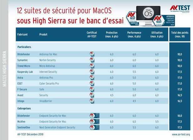 Les suites antivirus pour utilisateurs particuliers et pour entreprises ont été testées sur des iMacs de construction identique avec le système MacOs High Sierra 10.13.3. Le test comporte trois sections : Protection, Rapidité et Utilisation. Dans le dernier point, il s’agit principalement des fausses alertes déclenchées par les suites. Dans chaque section, une suite peut obtenir jusqu’à 6 points, soit une note maximale de 18 points.