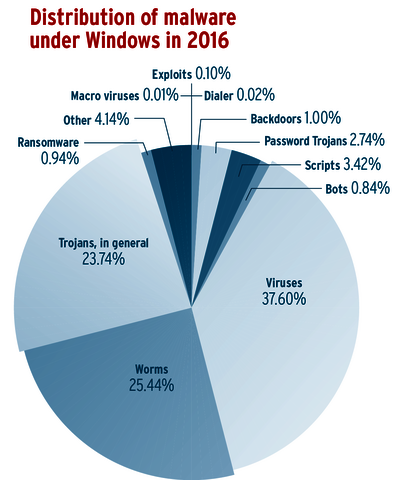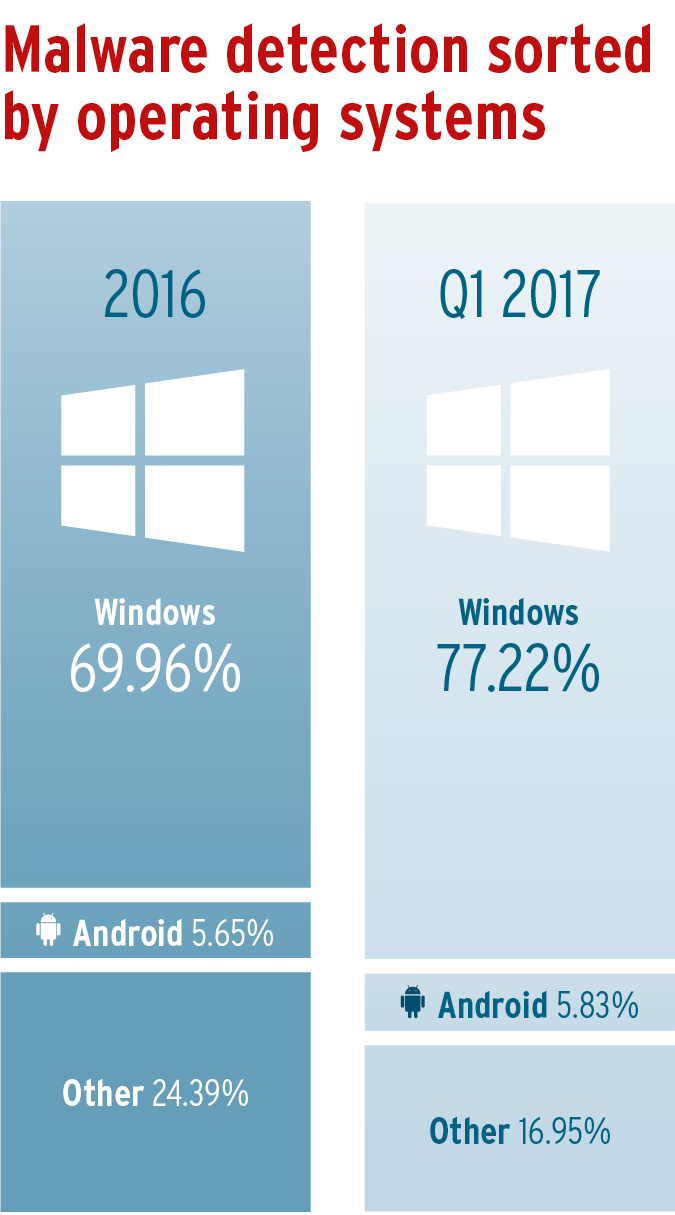 La tendance à la baisse des malwares en 2016 a au moins permis de soulager quantitativement les dispositifs antivirus. Les systèmes de reconnaissance ont ainsi dû identifier 14 % de nouveaux échantillons de logiciels malveillants en moins que l’année dernière. Le nombre total de programmes malveillants pour tous les systèmes d’exploitation reste malgré tout énorme et dépasse actuellement les 640 millions. Ce faisant, Windows reste leur cible privilégiée. En 2016, 70 % des nouveaux logiciels malveillants programmés visaient la plateforme Microsoft.