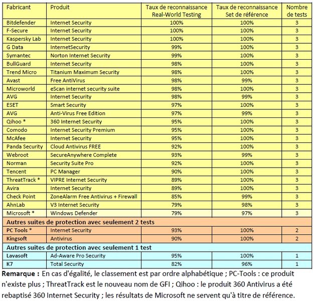 L'ordre est aussi similaire dans le classement global. Tandis que Bitdefender, Kaspersky Lab et Symantec dominent, les suites de protection d'Avast, de F-Secure et de G Data se partagent la quatrième place.