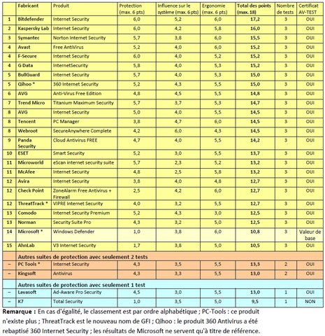 Le bilan ne traite que des suites de protection ayant participé aux trois tests de janvier à juin. Les suites avec deux tests ou moins ne peuvent pas être comparées aux autres produits.