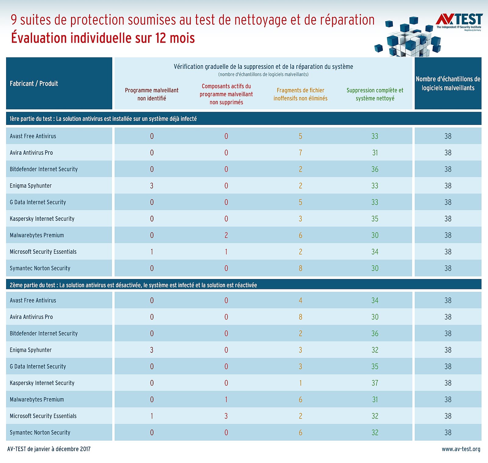 Lors d'un test, la perfection absolue est naturellement atteinte lorsqu'un système testé retrouve son l'état initial d'avant l'attaque. Les programmes malveillants identifiés doivent donc être supprimés, d'autres modifications doivent être annulées et tous les fragments de fichiers même inoffensifs doivent être supprimés. Cette performance parfaite n'a certes pas été atteinte, mais certaines suites ou certains outils n'en étaient pas loin.