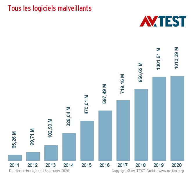À la fin de l’année, les banques de données d’AV-TEST ont franchi le seuil du milliard d'exemplaires de maliciels et d’API. On y trouve tous les exemplaires enregistrés et analysés jusqu’alors et qui sont suspectés de receler une fonction nuisible (maliciel) ou qui sont potentiellement indésirables (API). Les chiffres exacts et actualisés en permanence se trouvent sur la page des statistiques d’AV-TEST. Le nouveau portail AV-ATLAS présente également en détail les menaces actuelles dans le domaine des spams, des e-mails et des liens et bien plus encore.