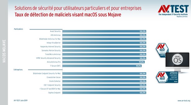 Si vous pensez que les utilisateurs de Mac ne sont pas des cibles intéressantes pour les chevaux de Troie, les ransomwares et autres, vous vous trompez. AV-TEST collecte, enregistre et catalogue de plus en plus de virus qui s’attaquent au système Mac. Afin d’augmenter la sécurité des appareils Mac, le marché propose plusieurs logiciels antivirus. En juin 2019, le laboratoire d’AV-TEST a testé un grand nombre de ces suites avec le nouveau système MacOS Mojave : 10 d’entre elles sont destinées aux particuliers, 6 aux entreprises.