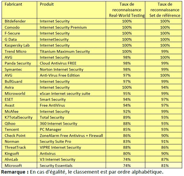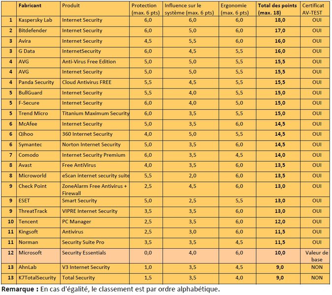 Les solutions de Kaspersky Lab, Bitdefender et Avira (version payante) occupent les trois premières places. Avec une note de 6/6 dans chacune des trois catégories du test, la suite de protection de Kaspersky a obtenu la note maximale de 18/18. Bitdefender suit de près avec 17/18.