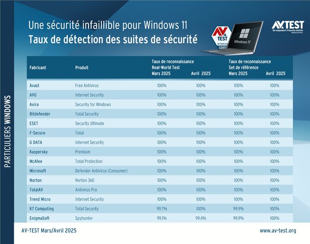 Le laboratoire d'AV-TEST a analysé la capacité des suites antivirus disponibles sur le marché à protéger les systèmes contre toutes sortes de logiciels malveillants. Dans le cadre du test actuel réalisé aux mois de mars et avril 2025, les experts ont testé l’efficacité de 15 suites de sécurité sur le plan de la protection, de la performance et de l’utilisation. Chaque produit peut obtenir jusqu’à 6 points dans chaque domaine et totaliser un maximum de 18 points. Tous les produits réalisant un score de 18 ou 17,5 points obtiennent en plus d’un certificat de sécurité éprouvée (« Certified ») la mention spéciale TOP PRODUCT.