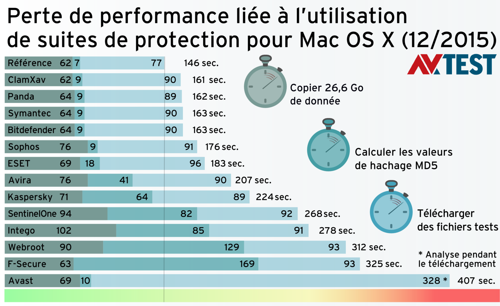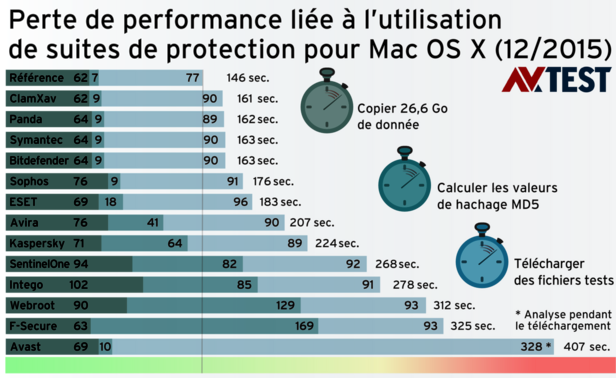 seules 4 solutions ralentissent le système Mac OS X d’uniquement 10 %, ce taux monte à 20 % pour Sophos, à 80 % pour SentinelOne et à 170 % pour Avast en raison de l’analyse effectuée directement pendant le téléchargement.