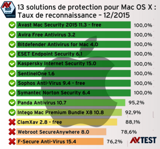 Les autres suites de sécurité ont cependant obtenu de moins bons résultats dans cette catégorie. Avec un taux d’identification situé entre 76,2 et 88,1 %, les solutions de ClamXav, Webroot et F-Secure sont les lanternes rouges du classement. Ces trois solutions n’ont donc pas obtenu le certificat de sécurité d’AV-TEST. Toutes les autres l’ont décroché.