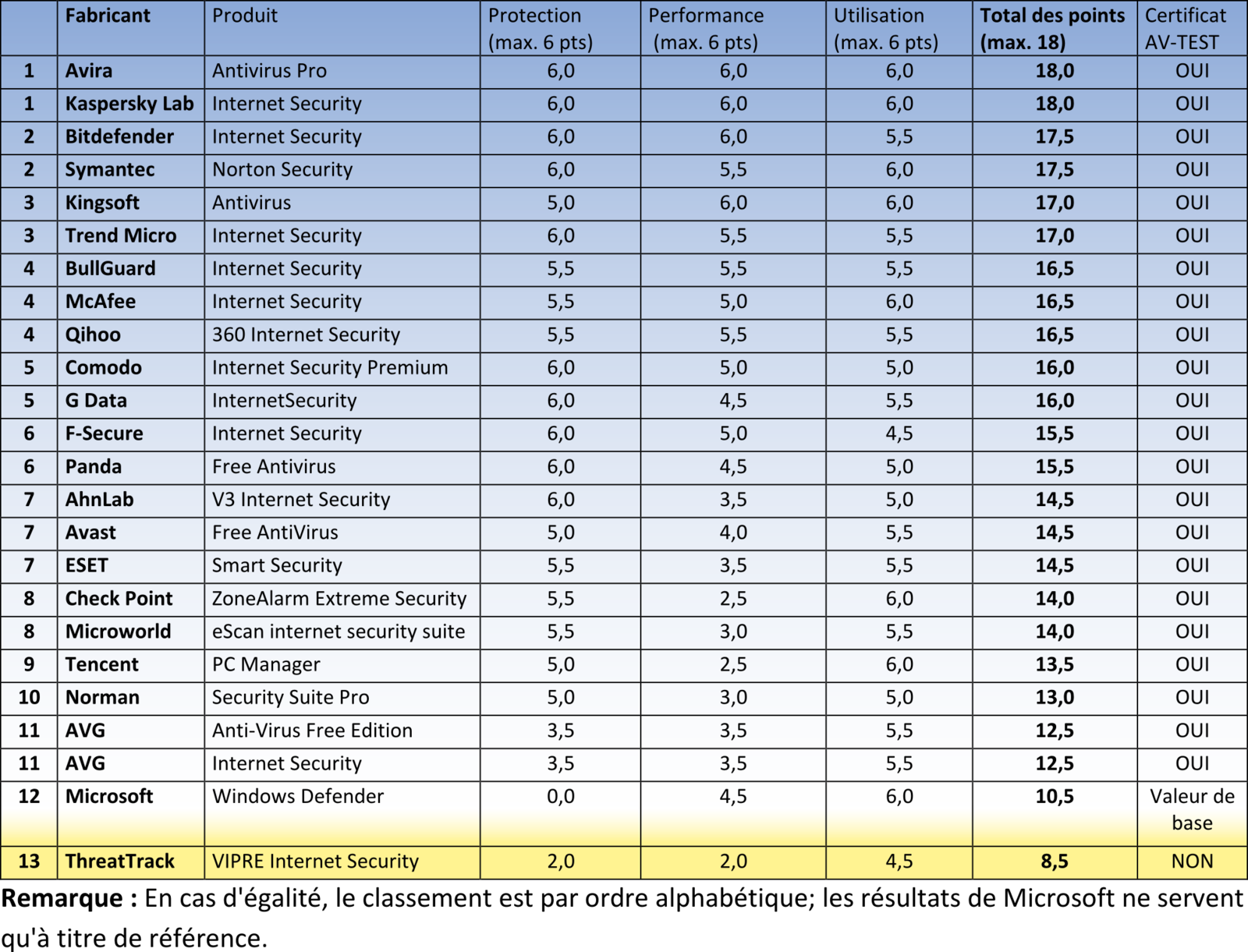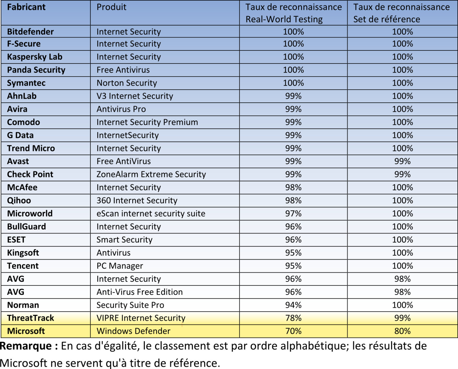 La protection de base de Windows appelée Windows Defenders qui a été testée à titre comparatif n'atteint que 10,5/18. Sa très faible performance en matière de reconnaissance de programmes malveillants lui a fait perdre bien des points.