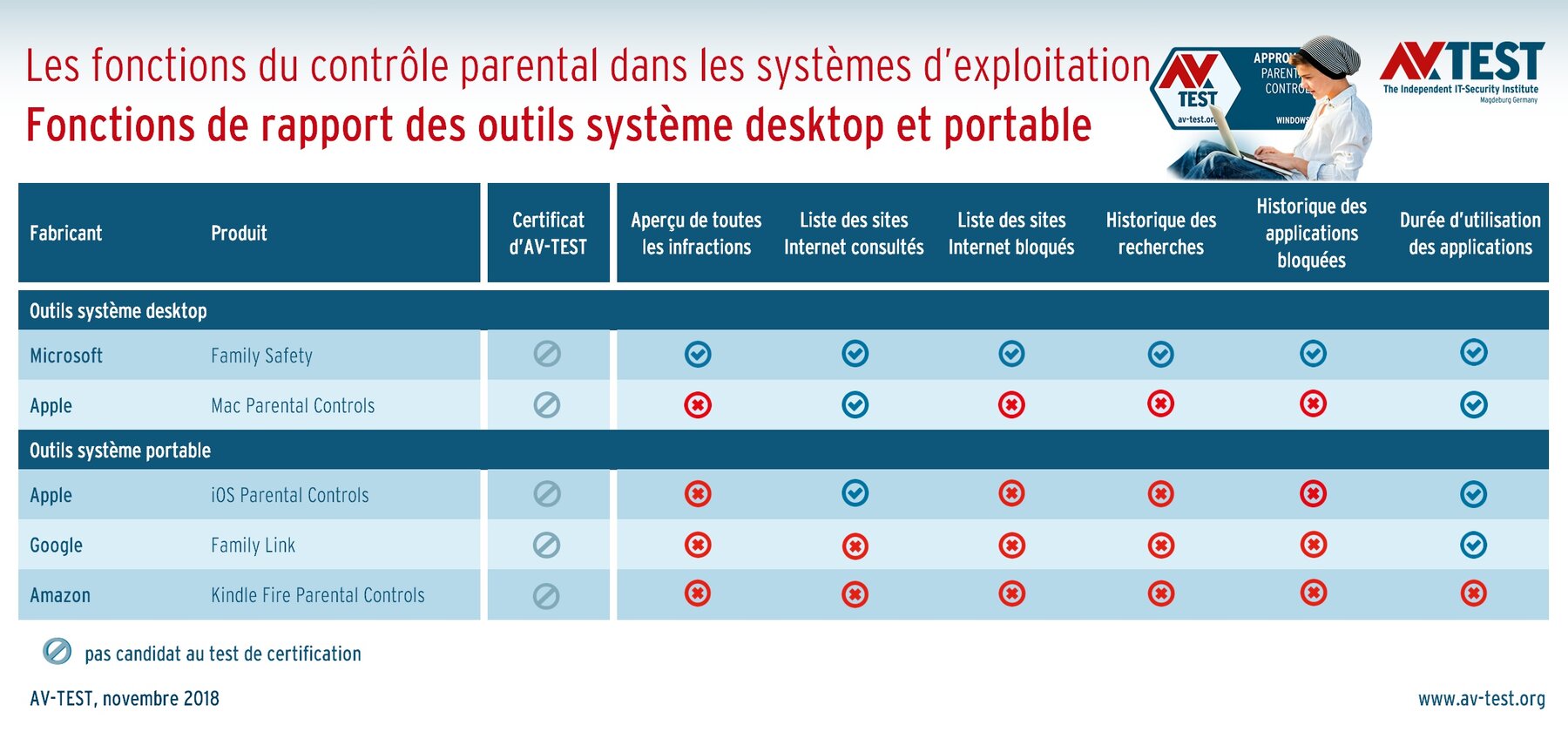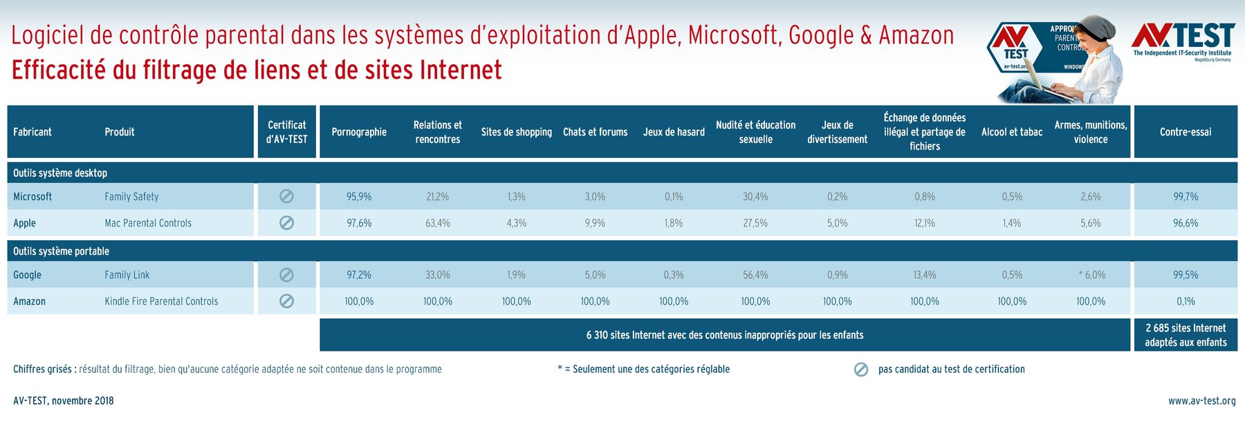 Ont été testés : Windows 10, MacOS High Sierra, Android 8.0, iOS 12 et Fire OS d’Amazon, un système Android adapté. Chaque système dispose de fonctions internes, les systèmes à desktop d’un logiciel supplémentaire. Les noms exacts des produits : Microsoft Family Safety, Mac Parental Controls, Google Family Link, iOS Parental Controls et Kindle Fire Parental Controls.