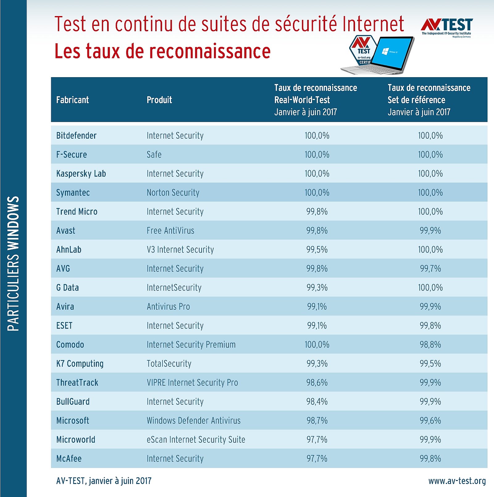 Le test en continu ne facilite pas forcément le choix de la meilleure suite de protection puisqu’il existe un grand nombre de solutions fiables. Si l’on s’appuie sur la note globale, alors les solutions de protection de Kaspersky Lab, Symantec, Trend Micro, Bitdefender et Avira présentent les arguments les plus convaincants. Elles ont obtenu des notes entre 17,5 et 18/18.