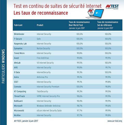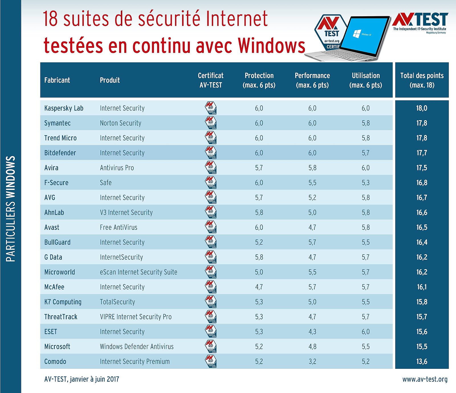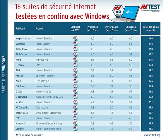 Les 13 suites ayant obtenu plus de 16/18 lors du test offrent une bonne protection, ralentissent peu le système et ne déclenchent pas de faux positifs. La suite de sécurité Internet de Kaspersky Lab a réalisé la meilleure performance ce qui lui vaut la note maximale de 18/18. Les produits de Symantec et Trend Micro suivent de très près avec un 17,8/18. Viennent ensuite Bitdefender avec un 17,7/18 et Avira avec un 17,5/18. Les meilleurs produits arrivent dans un mouchoir de poche.