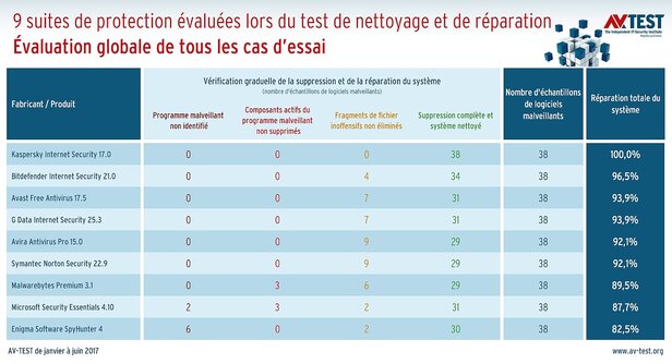 La seule suite de protection à avoir réussi à écarter les 38 attaques testées sans laisser un seul fichier, même inoffensif, est Kaspersky Internet Security. Viennent ensuite les produits de Bitdefender, Avast, G Data, Avira et Symantec. Ils n’ont laissé que 4 à 9 fragments de fichiers non dangereux. Cependant, le système était réparé et ne présentait plus de programme malveillant.