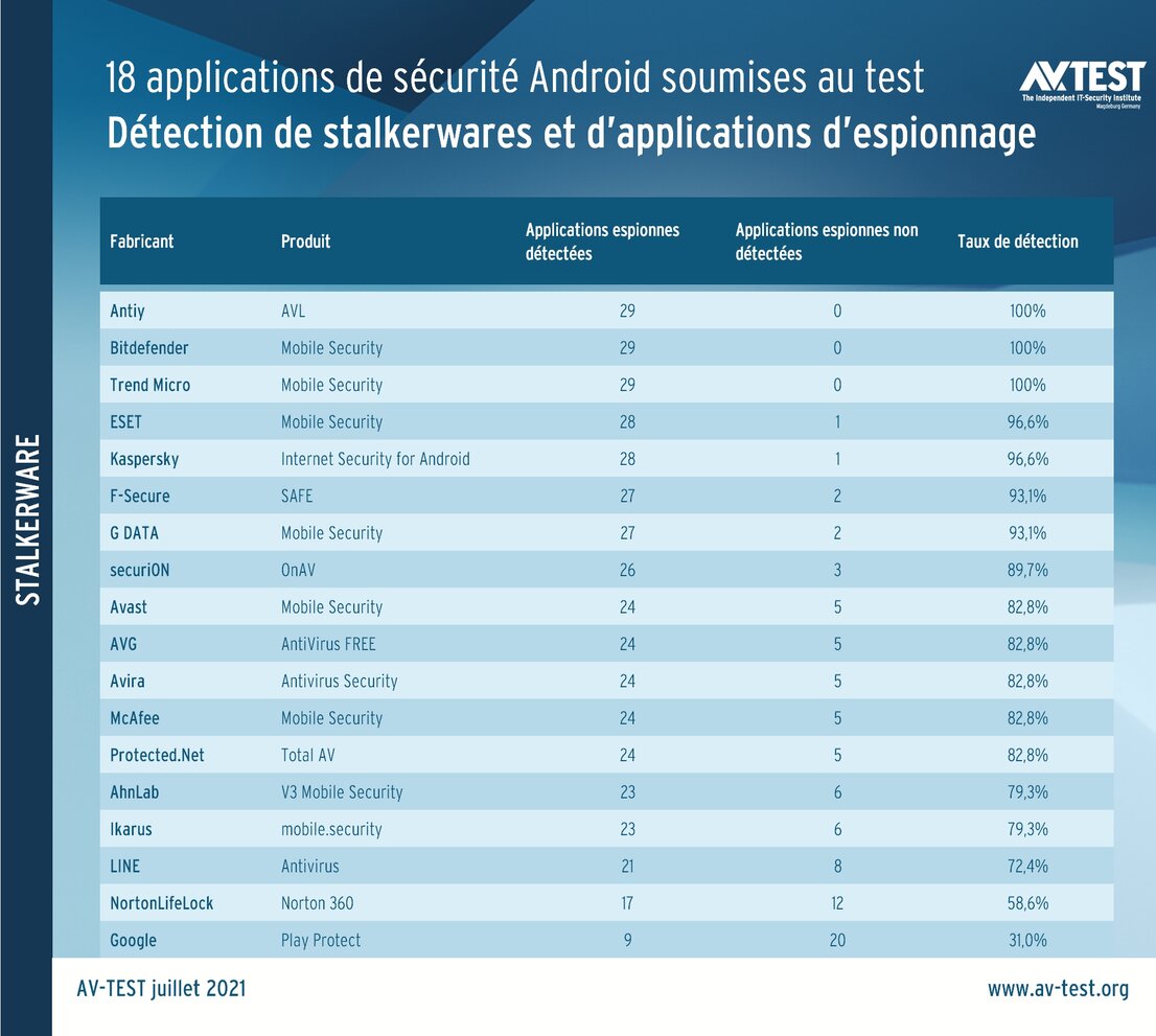 Au total, 18 applications de sécurité pour Android montrent en laboratoire leurs capacités à détecter les logiciels espions. Les applications mises au banc d’essai sont celles d’AhnLab, Antiy, Avast, AVG, Avira, Bitdefender, ESET, F-Secure, G DATA, Google, Ikarus, Kaspersky, LINE, McAfee, NortonLifeLock, Protected.Net, securiON et Trend Micro.