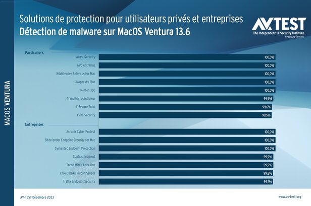 Le test de décembre 2023 sur les logiciels de protection de MacOS Ventura 13.6 montre que les 15 produits testés protègent efficacement les systèmes. En ce qui concerne les produits destinés aux utilisateurs privés, 6 des 8 suites testées méritent le score maximal de 18 points à l’issue du test : Avast, AVG, Bitdefender, Kaspersky, Norton et Trend Micro. Ils sont suivis par Avira et F-Secure qui réalisent le très bon score de 17 points.