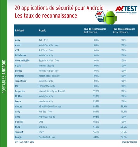 Si vous souhaitez mieux sécuriser votre appareil Android, vous trouverez rapidement la bonne application dans le test actuel. Les résultats montrent que Google Protect n’offre pas de protection suffisante. Au total, 12 applications sur les 20 testées ont obtenu la note maximale de 18 points : il s’agit des applications d’Antiy AVL, Antiy AVL Sec, Avast, AVG, Avira, Bitdefender, Cheetah Mobile, ESET, G Data, McAfee, Symantec et Trend Micro. Certaines de ces applications sont même gratuites, d’autres disponibles contre un petit forfait annuel, car elles proposent d’autres fonctions Premium – VPN par ex.