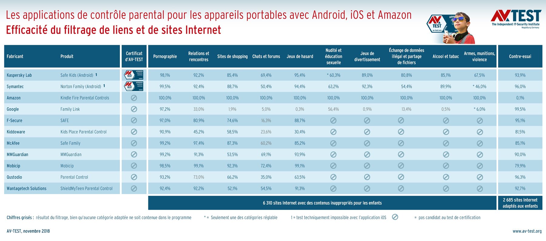 Le laboratoire a tout d’abord examiné les solutions des systèmes. Dans le système Android de Google, on peut utiliser l’application Family Link, chez Apple, on peut activer l’iOS Parental Control et chez Amazon les fonctions de protection de Kindle Fire OS. Les applications Safe Kids de Kaspersky Lab et Norton Family de Symantec ont été mises au banc d’essai pour un test de certification plus approfondi. Les deux sont disponibles en version iOS et Android. Elles ont obtenu respectivement le certificat « APPROVED Parental Control Android 11/2018 » et « APPROVED Parental Control Apple iOS 11/2018 ».