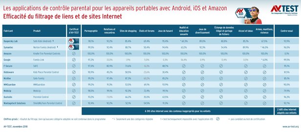 Le tableau du test montre que beaucoup d’applications ont certes un grand choix de catégories, mais qu’elles ont du mal à faire le tri. Disons-le tout de suite : les Kindle Fire Parental Controls actifs d’Amazon filtrent à 100 pour cent, puisqu’ils filtrent tout simplement tous les sites – même les bons. Si le contrôle parental est activé, il n’est alors pratiquement pas possible de surfer. Chez Google, Family Link identifie bien les contenus pornographiques, mais ignore toutes les autres catégories. Les applications également testées en comparaison montrent en partie de bonnes capacités de filtrage dans les catégories présentes, à quelques exceptions près. Les applications Android de Kaspersky Lab et Symantec couvrent bien toutes les catégories testées et font une sélection relativement bonne. Malheureusement, le test des variantes iOS n’a pas été réalisable techniquement. Presque toutes les applications ont réussi le contre-essai avec des sites adaptés, atteignant un taux satisfaisant de 90 à 99 pour cent, excepté le contrôle parental Kindle chez Amazon.