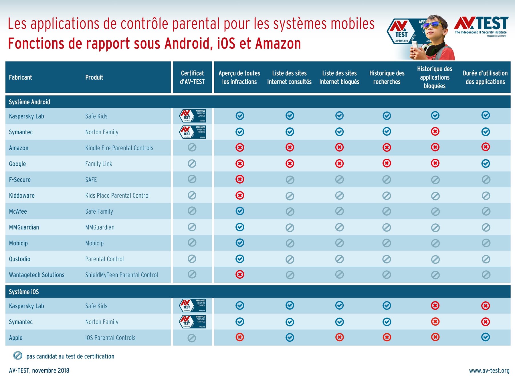 Pour faciliter la comparaison, certaines fonctions principales des applications de contrôle parental des fabricants suivants ont également été testées : F-Secure, Kiddoware, McAfee, MMGuardian, Mobicip, Qustodio et Wantagetech Solutions.