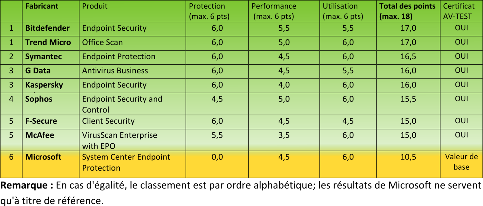 À titre uniquement comparatif, le module Endpoint Protection 2012 de la suite Microsoft System Center 2012 a également été testé comme protection de base ce qui en fait la 9e solution. Cette solution est seulement incluse avec la suite de gestion de Microsoft, elle ne peut pas être achetée séparément.
