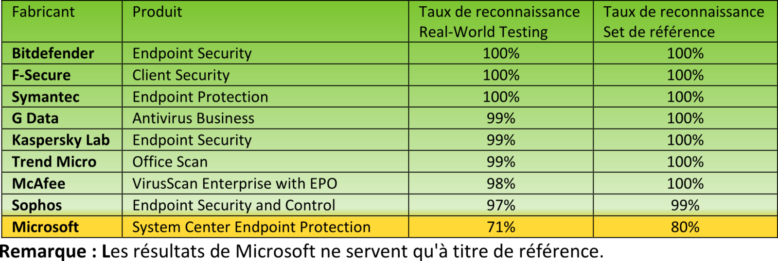 Le module System Center Endpoint Protection de Microsoft testé à titre comparatif ne constitue pas une alternative recommandable. Avec 71 ou 80 %, son taux de reconnaissance des programmes malveillants est trop faible. Les premiers rangs atteignent ici 99 à 100 %.
