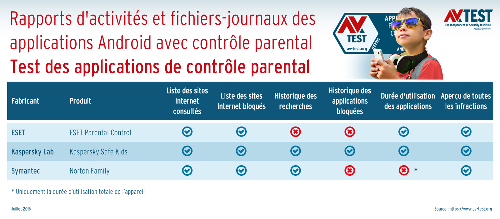 Les produits ESET Parental Control, Kaspersky Safe Kids et Symantec Norton Family ont satisfait à tous les critères de contrôle et méritent donc le certificat « APPROVED Parental Control Android 07/2016 » attribué par AV-TEST.