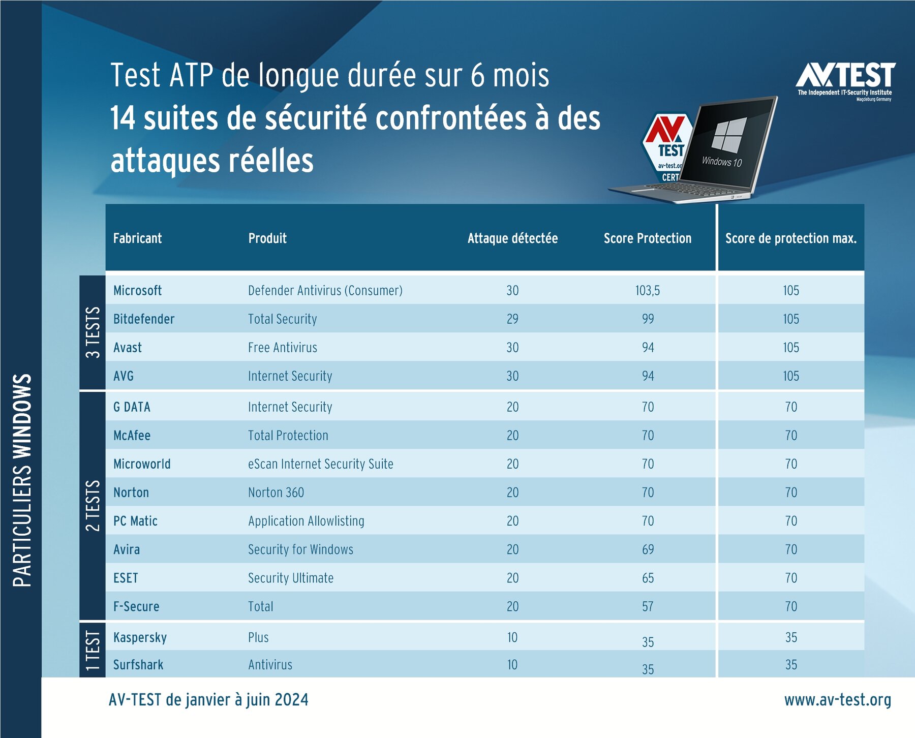 Tous les produits ont participé à 1, 2 ou 3 tests ATP. Chacun des tests est toujours effectué dans un délai de 2 mois. Ainsi, certains produits ont été testés sous Windows 10 pendant 6 mois de janvier à juin 2024, d’autres solutions pendant 4 mois, et certaines ont passé un test pendant seulement 2 mois. Si les résultats des produits soumis à un test sont intéressants, les tests réalisés sur une période de 4 à 6 mois offrent un bon aperçu de la qualité de protection dans la continuité.