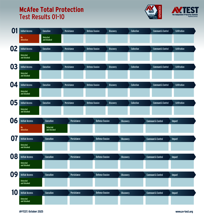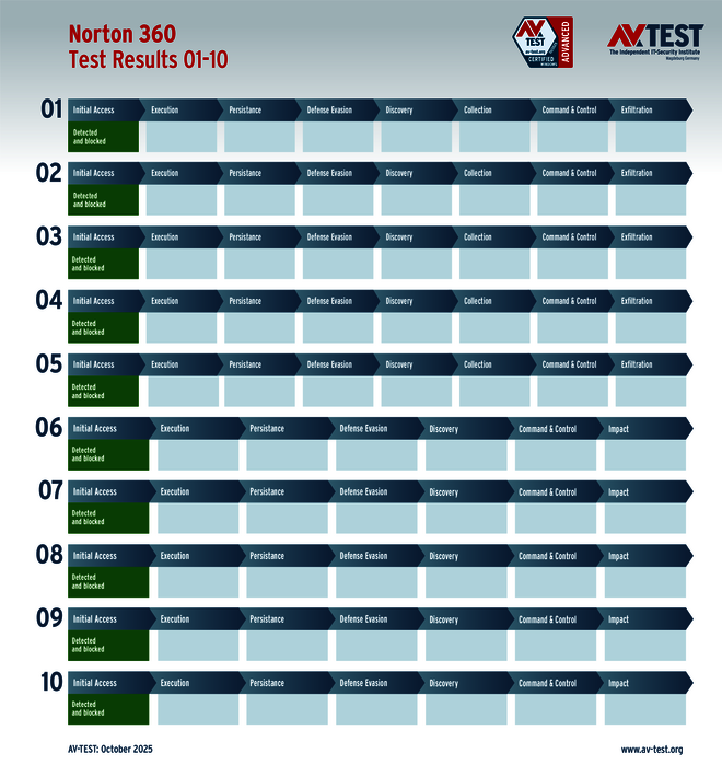 Chaque produit testé est confronté respectivement à 5 exemplaires de ransomware et de voleurs d'informations. Chaque étape de défense documentée rapporte un nombre de points défini, à savoir jusqu’à 3 points pour les ransomwares et jusqu’à 4 points pour les voleurs d'informations. Si la défense ne réussit que partiellement à une étape, le laboratoire attribue des demi-points. À la fin du test, chaque produit peut remporter jusqu’à 35 points au score de protection.