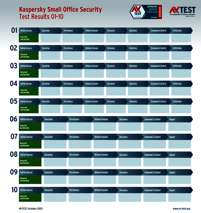 Le laboratoire a testé tous les produits en les soumettant à 10 scénarios d’attaque réels, documentant chaque étape de la défense. Un point intéressant : même si un programme malveillant n’est pas immédiatement détecté ou ne l’est que pendant son exécution, des mécanismes de défense se déclenchent par le biais de modules de protection qui interagissent en aval. Ceci permet de sauver un système alors même que le programme malveillant semblait avoir le dessus dans les premières étapes de l’attaque.