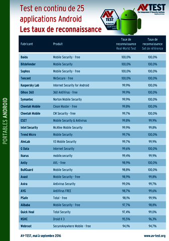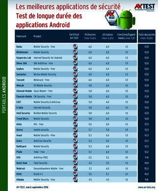 Les applications ayant mérité un 13/13 sont celles de Bitdefender, Kaspersky Lab, Qihoo 360, Sophos, Symantec, Tencent et Baidu. Celle de Baidu n’est cependant disponible qu’en chinois. Les autres applications ayant obtenu la note de 12,8/13 présentent toutes un point commun : elles ont fait une toute petite erreur lors du test de protection qui a été fermement sanctionnée par une pénalité. Elles n’ont donc toutes obtenu qu’un 5,8/6 pour cette catégorie.